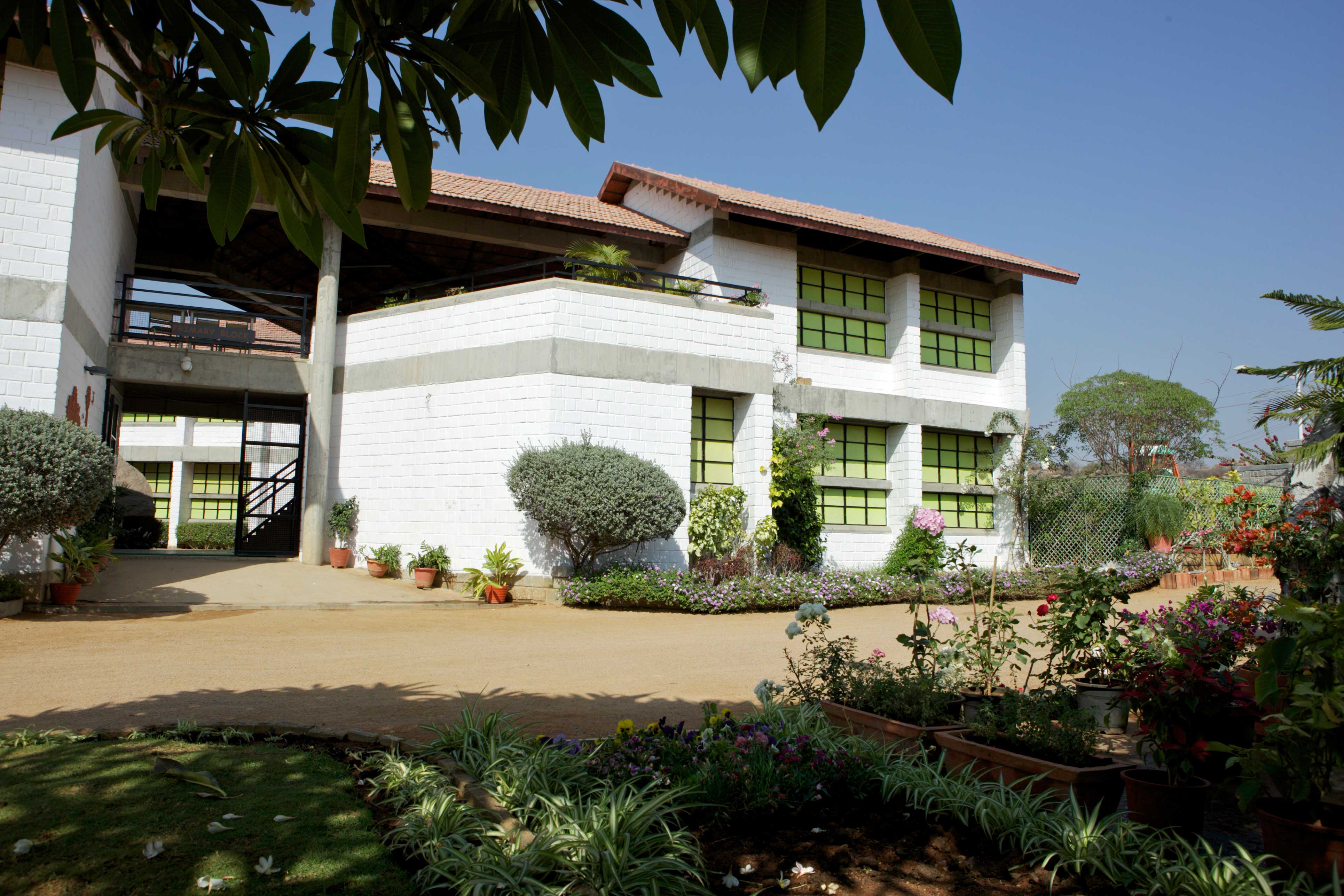 Set within suburban Hyderabad closer to the expressway, The Future Kids School occupies a condensed sprawl amidst a sparse urban landscape imbued with an occasional cluster of neighbouring buildings. The set of buildings sits in alignment to a notional corner of the 2.36 acre site; its architecture submissive to the topography that gradually recedes to a drop of 4m from north-east corner to south-west corner and to selective materiality. Isolated in parts, juxtaposed in some pockets, the cohesive construction rises linearly as a complex of two and three storeyed buildings, above the stark boulders that border the premises.