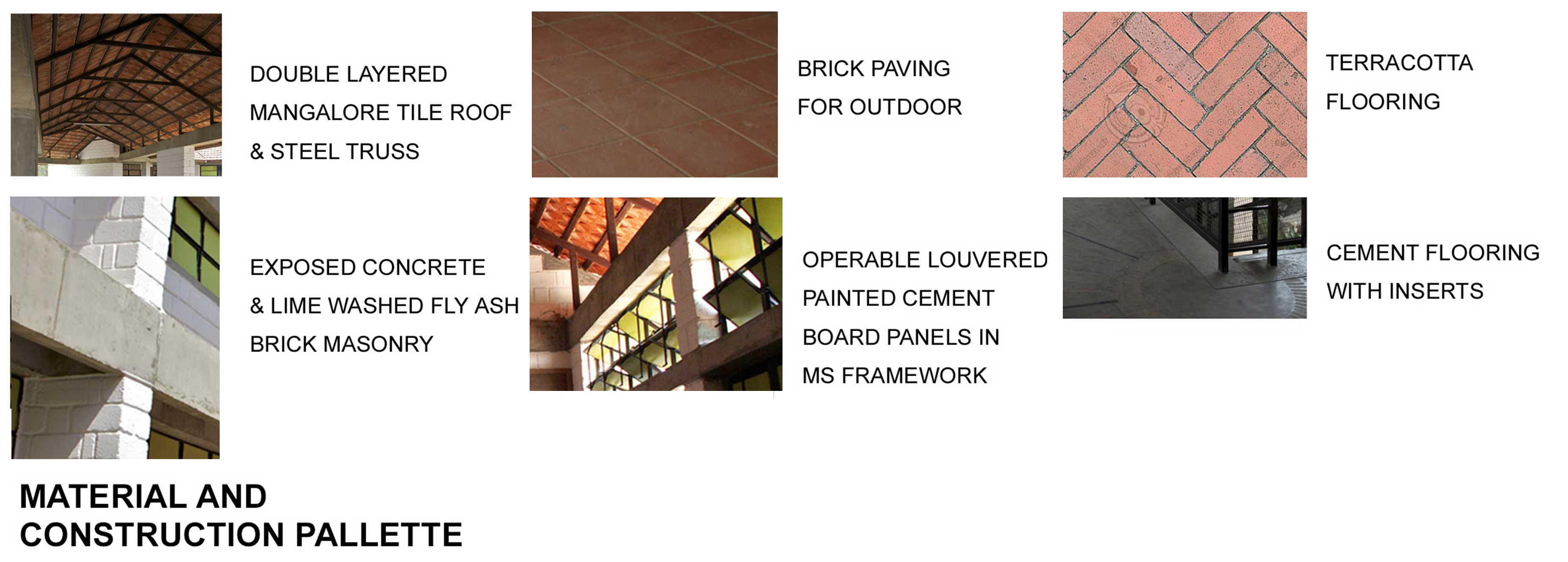 The thermal experience is charted through passive solar control methodologies. In the overall planning, tempered glass has been used in lesser than 5 per cent of the window area and only where transparency was required. The locally-fabricated windows are designed as operable louvered self-shading openings, devised from cement boards anchored to MS, and a vent at the eave level in each classroom, ensures adequate ventilation & light. The double-layered Mangalore-tiled roof on a bed of RCC and steel, stretching out as overhangs, verandah & courtyard spaces carved out in the design, and the porosity in planning mitigate heat and the vagaries of the tropical wet and dry climate.