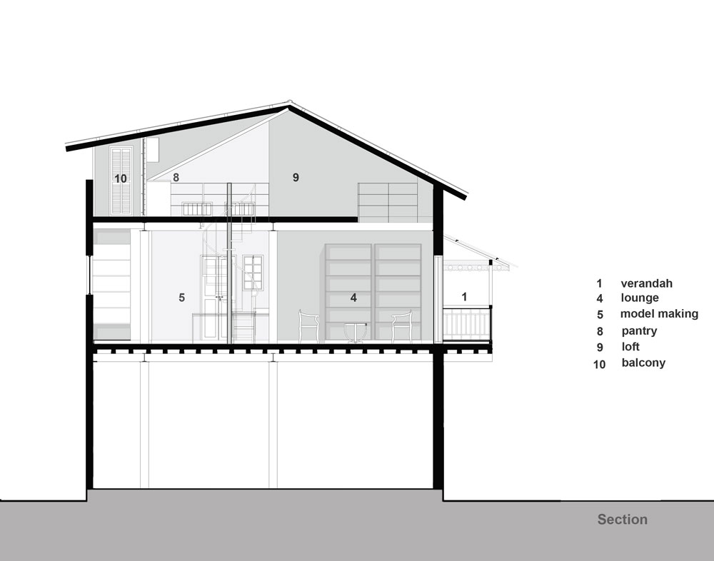 Inconspicuous in light polished granite, thoughtfully placed library shelves feature throughout. “The studio library is large, constantly growing and currently has about 600 books, with a capacity to hold about a 1000 books. The material used for the shelves is polished granite. By using a light coloured stone the shelving is kept visually light and adds a unique material and textural character to the space. The size, proportions and heights, and locations of the shelves were carefully thought through in the design process, as they would have a huge bearing on the overall ambience of the space.,” say the architects.