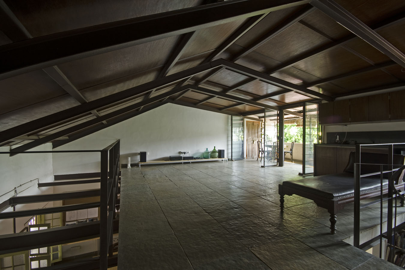 The attention to each aspect generates a harmonic and tactile encounter; the reticent colour palette, the semi-polished brown Kota stone floor that was specially ordered from Udaipur in thin slabs to reduce the structural load, the fixtures that are prudently located in the recesses of the structural framework and old light fittings that were found from Chor Bazaar in Mumbai. In controlled moments of chance and detail, seemingly impulsive gestures such as selection of the dull green for the original door & window frames against the off-white interior surfaces, a reclining chair and choice of art, enliven the place. Elaborating on this, the architects mention, “The studio has a large collection of original art and artifacts, thoughtfully assembled over the years. There are wooden columns and building elements juxtaposed with ‘pato-chitra’ paintings and sketches by architects. Small sculptures in stone and clay and old pots and marble bowls create a sense of history and are an important part of the ambience of the studio. While selecting and placing the artworks in the studio, careful thought and a less is more approach was maintained. The paintings and objects in the studio are an integral aspect of the interior design of the space and act as a constant reminder and inspiration of the great tradition of art and craft in India.”