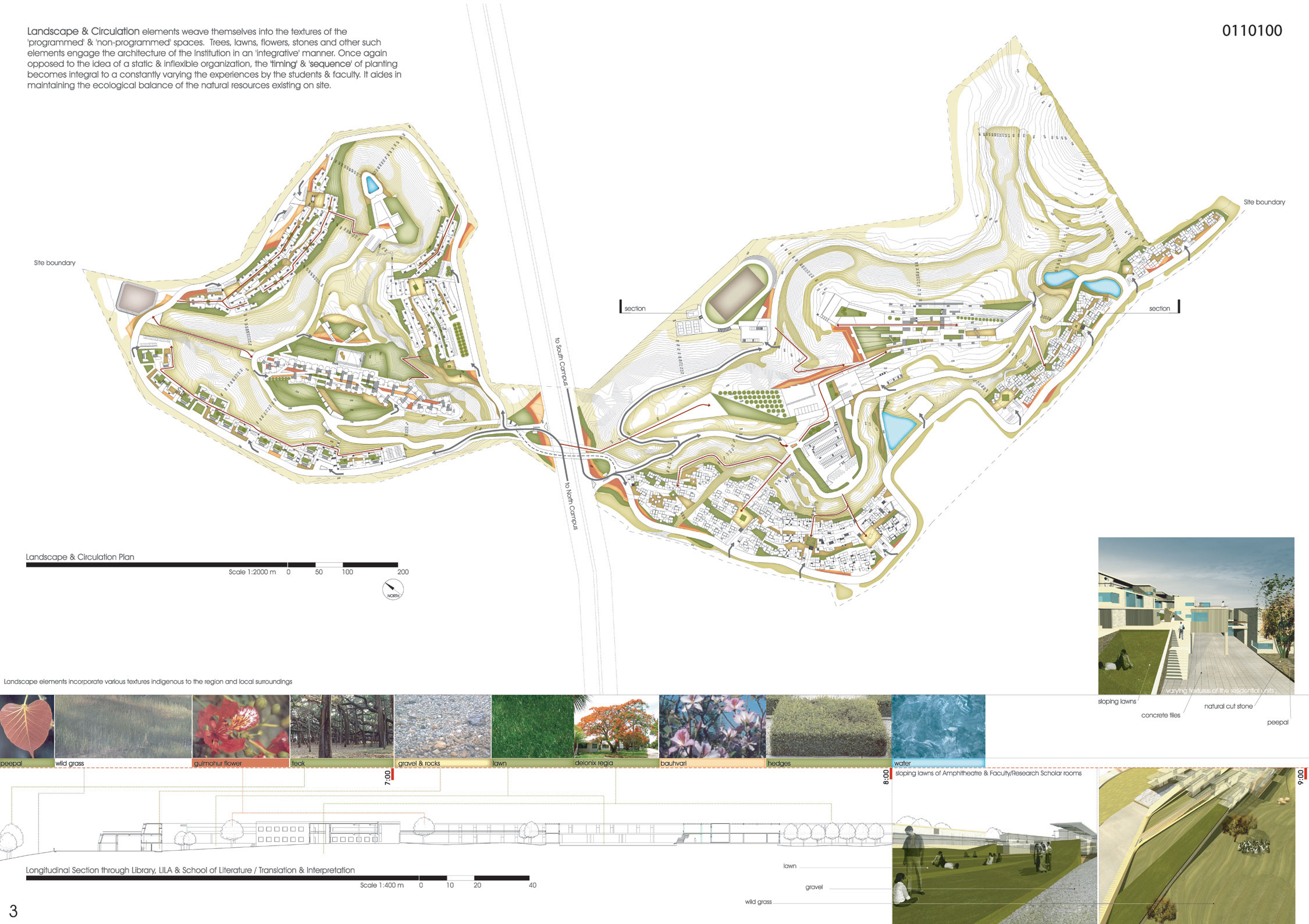 Among the design concerns, flexibility and sustainability were at the forefront. Introspectively, the architectural language of the project has legible abstractions that can explain ecosystems. Situated on an undulating terrain, contour ploughing is practised to minimize erosion of topsoil, reducing cut and fill in the process. The placement of buildings is evidently a result of topographic adherence. The resulting scheme is fragmented with interconnecting levels that create a dramatic visual interplay.