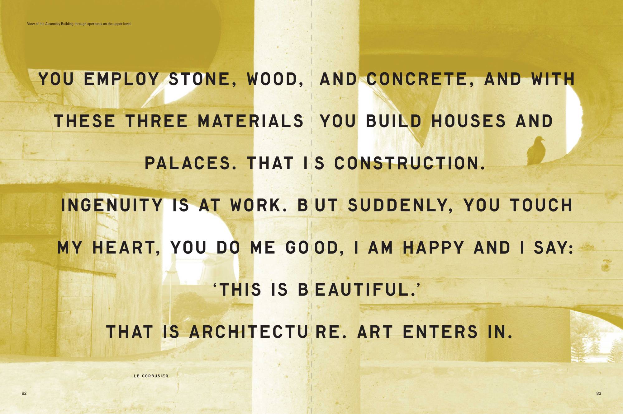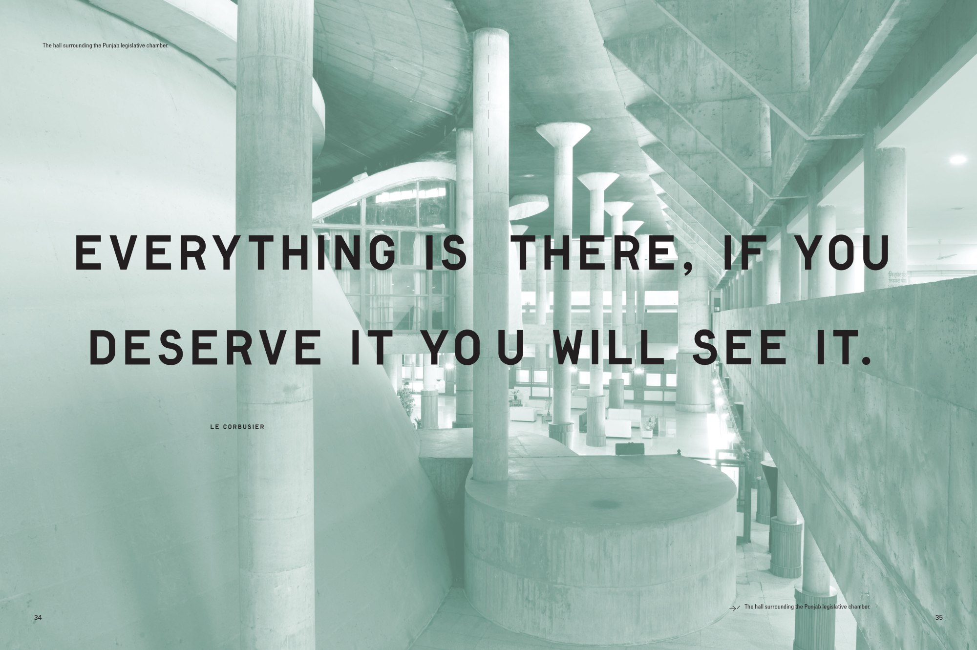 The colour palette in these frames is reminiscent of Le Corbusier’s palette. Details of access ramps with a red wall at background and photos of men sporting red and yellow turbans against the concrete highlight the incidence of bright colours against the grey walls. Splashes of yellow and orange with the architect’s quotes are laid out in the book, giving breaks to the photo-montage.