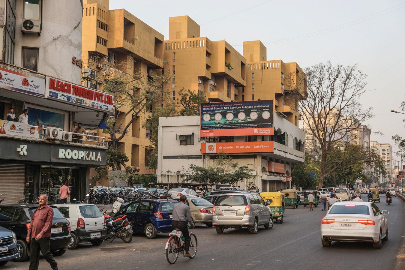 apartment. This is not a ‘flat’ that is born from the abstract yet thrifty imagination of built up areas and floor space indices. Apart from an internal generosity to each unit, the three residential blocks shift to make a garden. Much before it was the norm for ‘amenities’ this complex had a swimming pool and children’s play area. Its commercial block is organized around what could be called a ‘chowk’ at the corner intersection. This development draws from the best repository of architectural archetypes to create a new configuration for the city of its time. One senses that Centre Point is a development that has emerged from a generous imagination for ‘good living’. One can talk similarly about the Chinubhai Tower, a shopping complex and office building along Ashram Road. Here a sense of ‘public’, ‘civic’ space pre-occupies the project over its commercial status. These projects were amongst the first of their kind and they signalled the emergence of the first generation of ‘developers’, and a changing pattern of patronage that would drive the growth of the city of Ahmedabad. Hasmukh Patel’s professional engagement with this gave rise to several important buildings that make the Ahmedabad skyline legible.