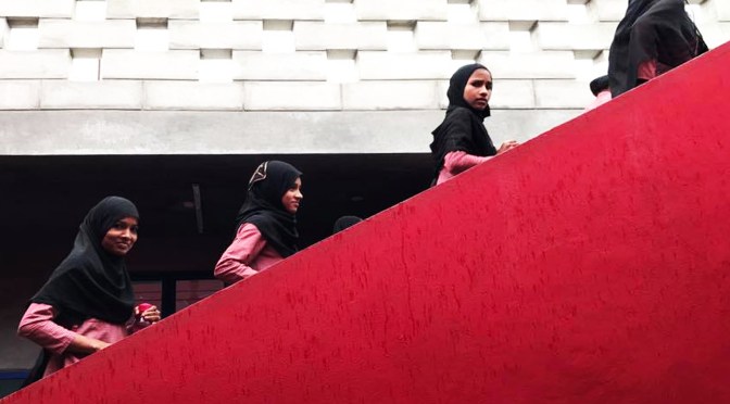 A portion of roof that is raised to bring in light into a corridor, leading to classrooms below, by means of ventilators divides it into two: a free play area and a large multi-purpose court enclosed by a high metal screen. This vantage point offers a spectacular view of the neighbouring low-rise housing settlements below on the uneven topography – the Golconda citadel, the domes of nearby Qutub Shahi Royal Tombs Complex and some of the new high-rise apartment towers merging into the city’s skyline. Retaining the topmost section as open with a minimal built-up area was an important decision taken early on in the design process. The open complex is a part of the larger site that includes a mosque built with a separate entrance, and a large shed covered in GI (Galvanized Iron) sheets. It was from this shed the school ran for four years using movable black boards to segregate class rooms before funds were raised for the new building and the construction started. A proposal was made to convert the shed into a dining hall/indoor games area for the students in the future.