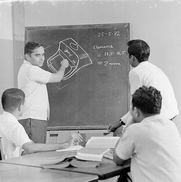 DIG201400564-copy January 3, 2019 600 × 601 IMPACT: DESIGN THINKING AND THE VISUAL ARTS IN YOUNG INDIA Mitter Bedi (1926-1985) | Dr. P. A. Joshi, Former Head, Central Design Department at Godrej & Boyce Mfg. Co. Ltd., discussing design of the typewriter with the design team c.1972 | Image Courtesy: Mitter Bedi Collection, Godrej Archives