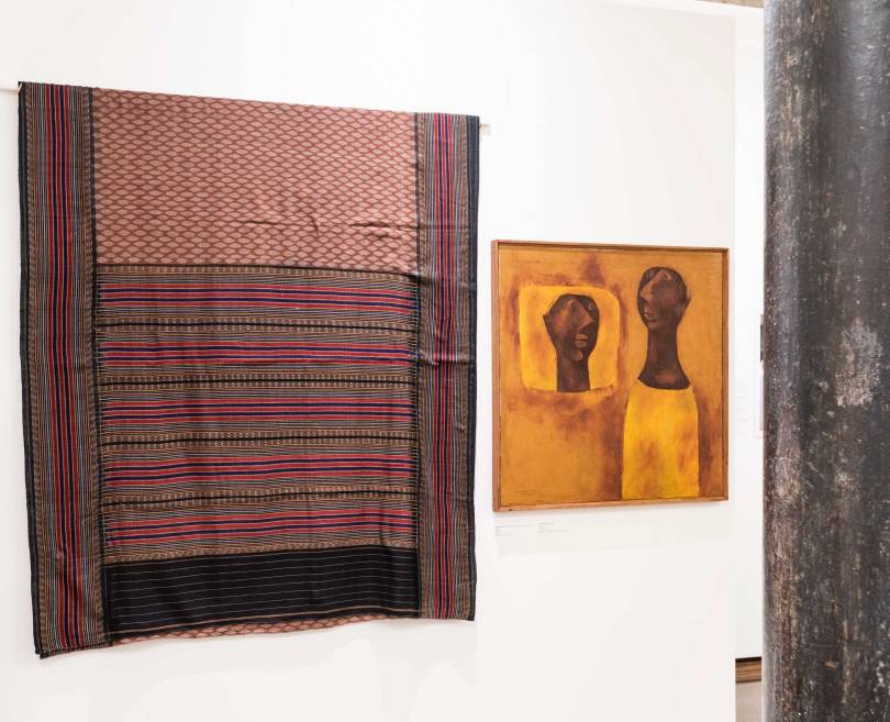 dsc7394 January 4, 2019 2691 × 2184 IMPACT: DESIGN THINKING AND THE VISUAL ARTS IN YOUNG INDIA Haku Shah (b. 1934) for Weavers’ Service Centre | Saree | 1959/60 | Cotton | Courtesy: the Artist and Chatterjee & Lal , Haku Shah (b. 1934) | Gossip | Circa 1985 | Oil on canvas | Courtesy: Jamshyd and Pheroza Godrej and Chatterjee & Lal