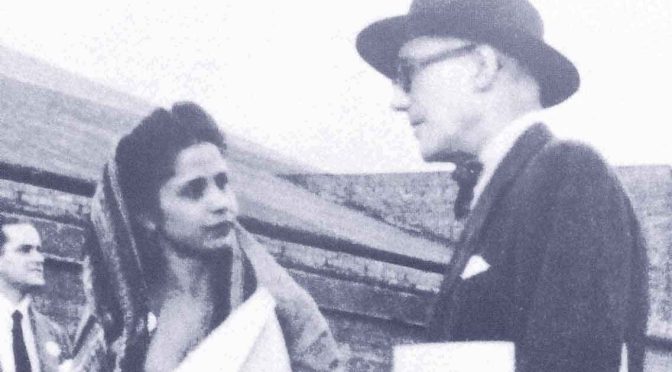 She offers a fictionalised account of Minnette’s meeting with Le Corbusier at the C.I.A.M. conference at Bridgewater in 1947, where they are introduced by ‘Elizabeth’, Pinto’s avatar of Jane Drew. This is the first of many distortions and untruths: in fact, Minette had been introduced to Le Corbusier by a mutual friend in Paris in the previous year, and had later shown him around the India Exhibition in London.