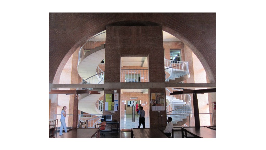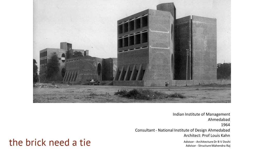 Raj also played the role of a structural advisor in another building in Ahmedabad; Louis Kahn’s Indian Institute of Management. Kahn envisioned the entire IIM campus in brick with the use of arches for spanning large openings. Here, Mahendra Raj’s inspired suggestion of using concrete ties to restrain the arches and take care of the outward thrust, enlarged the design vocabulary that Kahn developed at IIM.