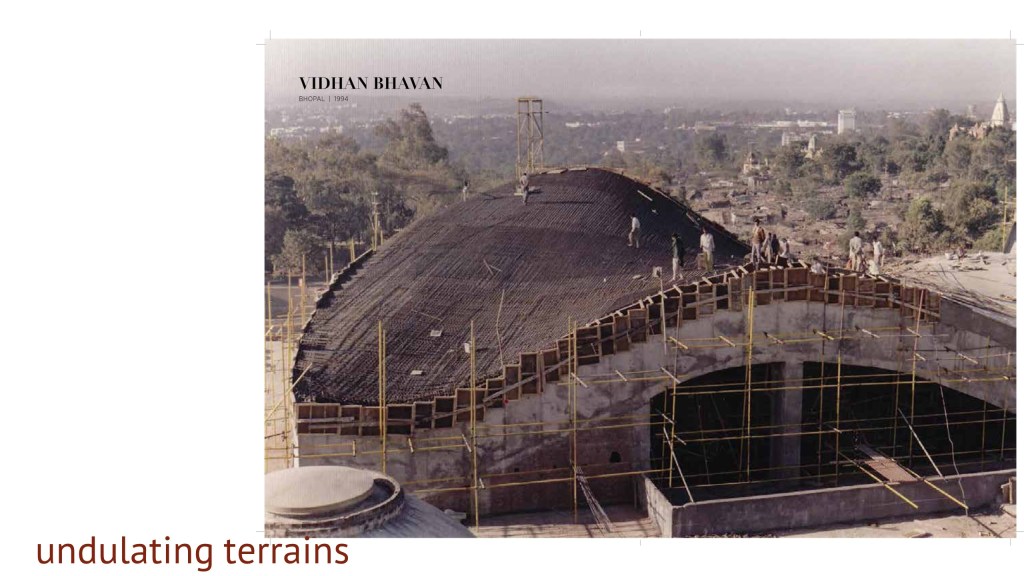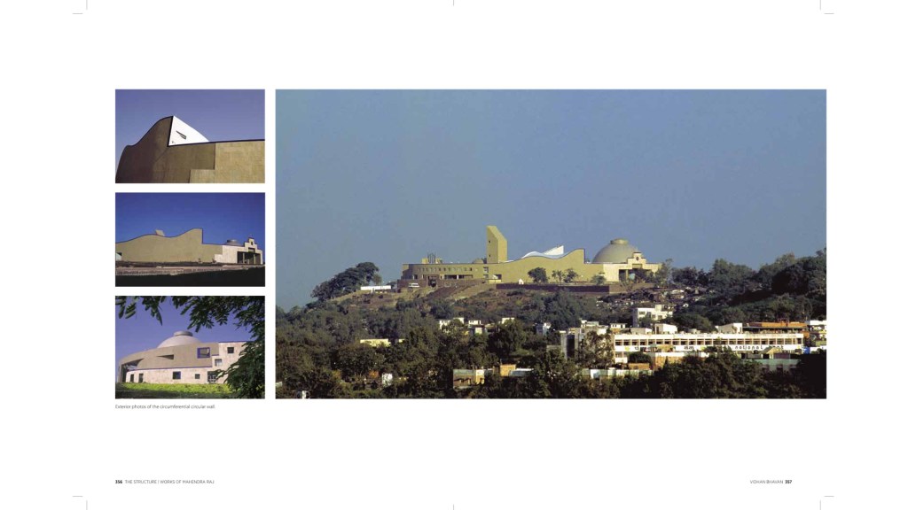 The Vidhan Bhavan in Bhopal built on the undulating terrain of Central India is circular in its form representing the architect’s move towards prioritising materials and narrative over structural expression. Still, this building’s main programmatic spaces had bold structural forms that created a roofscape of domes, shells and a tower which bear a distinctive stamp of Raj’s contribution.