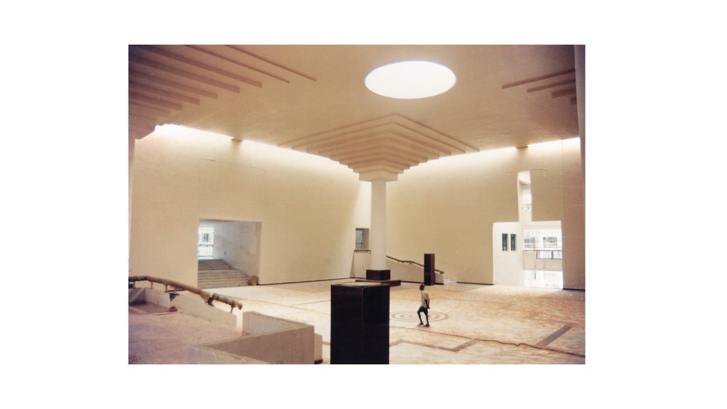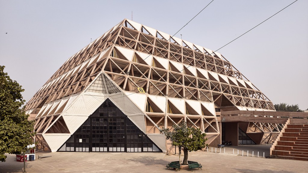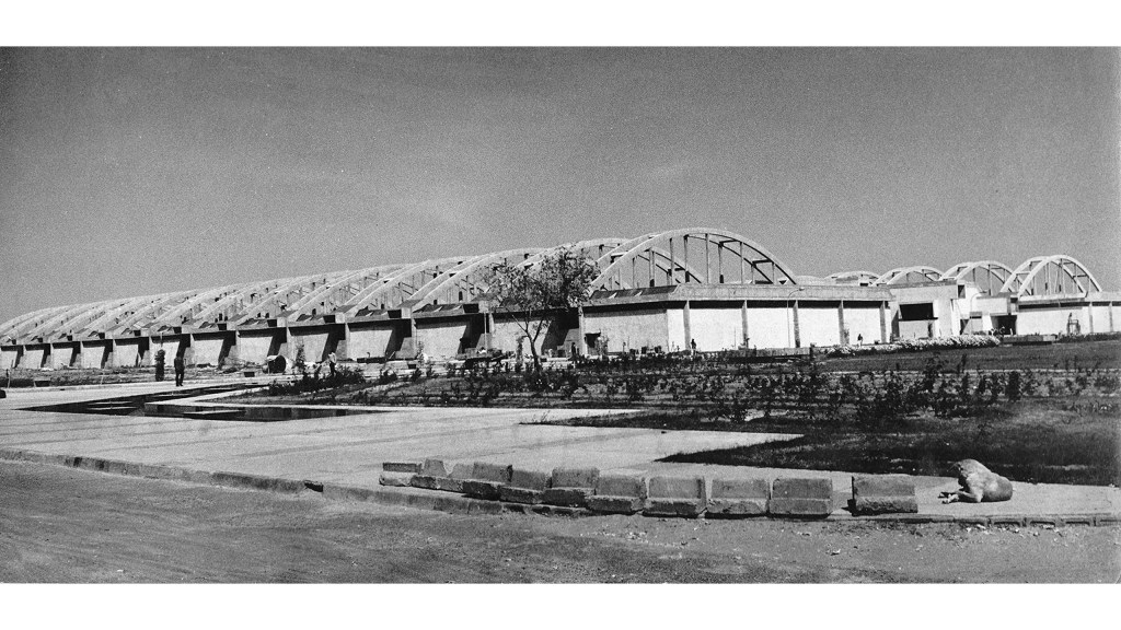 Mahendra Raj moved his practice to Delhi in 1970 where he built the Hall of Nations in 1972, a remarkable single exhibition space of 84 by 84 meters covered with a beautiful space frame structure. It is demolished now. Normally these structures are made in steel, but since it was scarce and very expensive, Raj designed it in reinforced concrete instead.