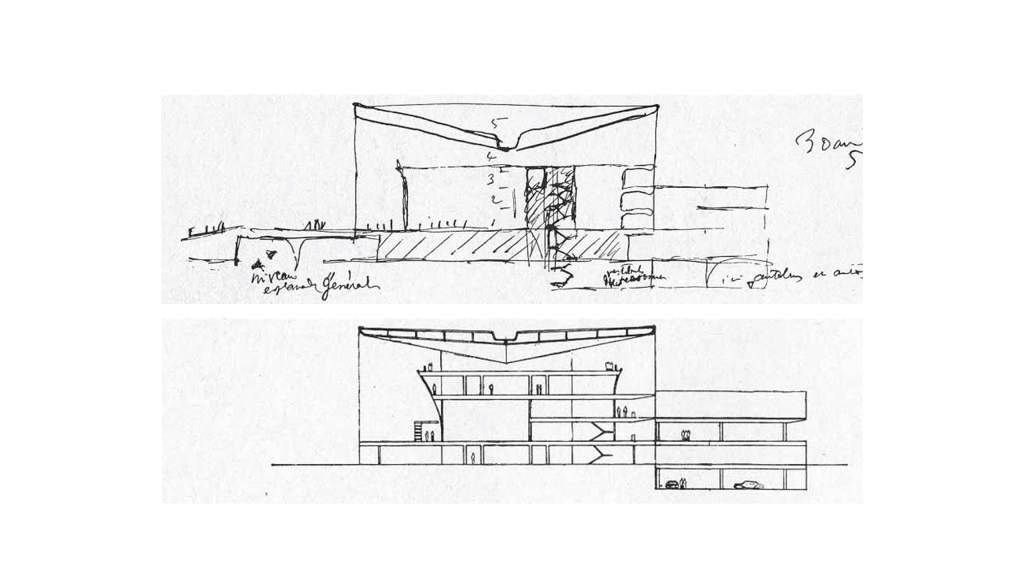 The next two outstanding buildings are in ‘folded plate’ in Ahmedabad. The first is a cricket stadium for the Ahmedabad Municipal Corporation completed in 1965. What is noteworthy is the delicacy and elegance that the structure attains as a thin fold plate, rises from the ground and forms an integral whole with the spectator stands and the twenty-meter cantilever roof. Each part of the structure works with the other in fine balance. (These are images of all the options he studied before he came to the final form.)