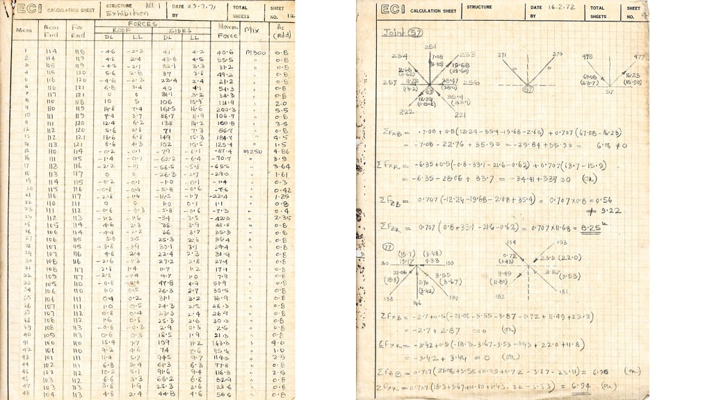 This transition is characteristic of his open-minded creativity that he coupled with carefully guided construction practices, which were vital, given the complexity of the reinforcement at the joints of the space frame. These are the different details he made good for execution drawings, first in steel, then in precast and then finally in reinforced concrete. So he never shied away from exploration and even taking that right to the end before it had to be given up. This delicate first-ever cast-in-situ large span space frame is a Gossamer Truncated Pyramid. Our favourite part about this project, which we believe is a secret of its delicate appearance is what we call the Robust Rhombus. This was the winning section over a circle, a triangle, and many others explored. It measures a mere 25 centimetres on each side. The section helped ease the busy joints of the nine to eleven members, some in tension, some in compression, coming together with a minimum of thirty-six bars passing through each node. Raj also carefully conceptualised the stages of construction. (These are some of the calculations sheets).
