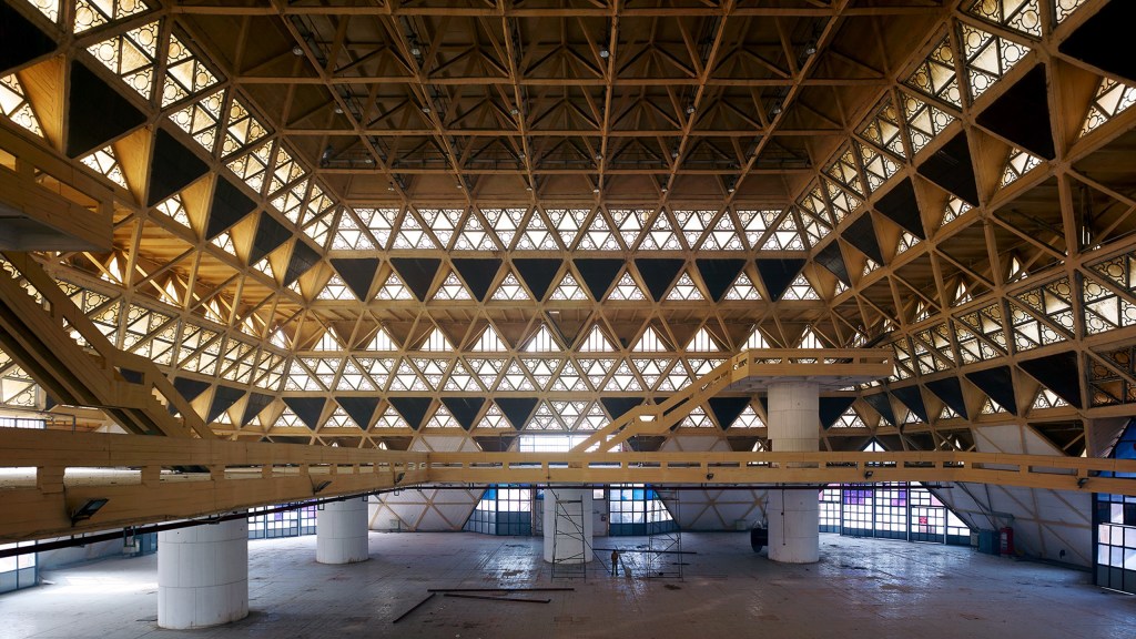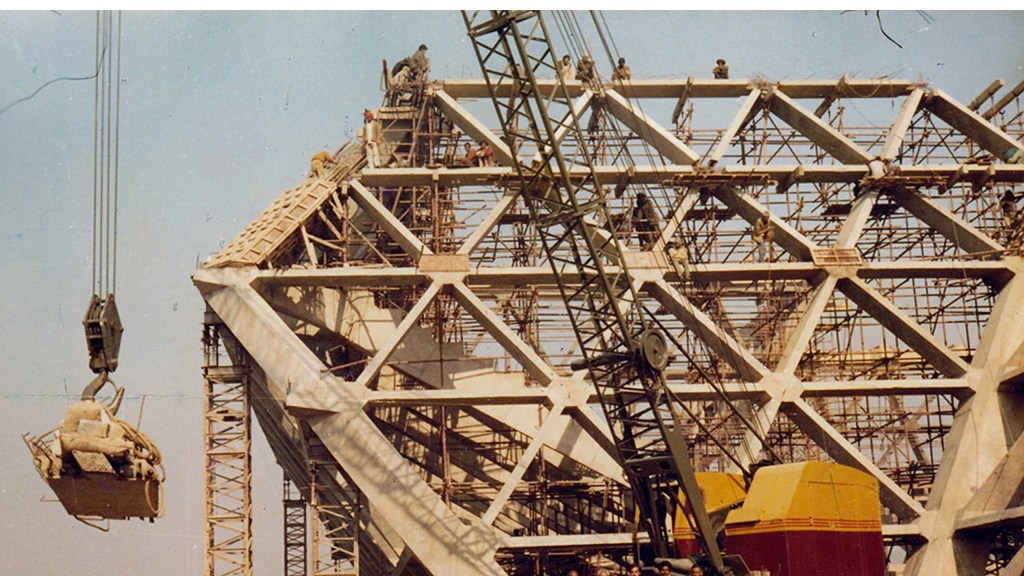 Finally, the 80s also showcase one of Raj’s greatest works, the Sports Stadium in Srinagar built in 1982. With the maximum cross length of 74 meters, the Indoor Stadium was originally designed by the architects as a cross plan with central pylons to help span the roof. Mahendra Raj suggested eliminating the pylons and instead proposed a structural system that radically altered the aesthetic quality of the building while still adhering to the original intent and basic cross plan. Reminiscent – at first glance – of the Hall of Nations, the stadium is based on an entirely different concept. Both have the triangular grids, but where the hall uses a double-layered Concrete Space Frame cast in-situ, the Stadium uses a single-layered Triangulated Plates, which taper outwards from the cross-shaped base to form a continuous ridge on which rest the seating system. The building is divided into four identical units. There are seven typical plates in each unit and twenty-eight plates in the entire structure that geometrically balance each other.
