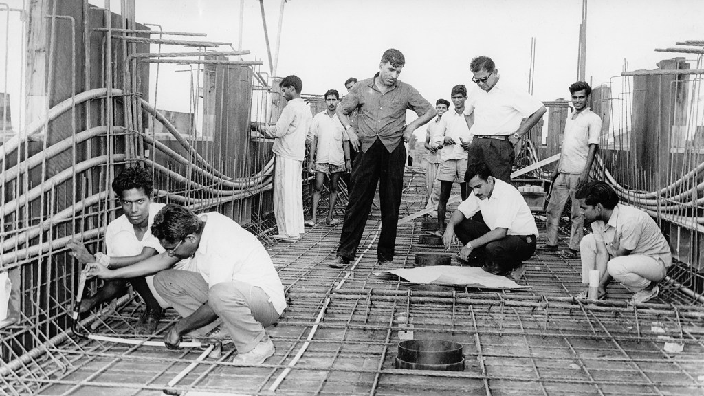 This is all pre-computer time, so these mammoth structures were built without any calculator, any computer analysis. Raj also carefully conceptualised the stages of construction to help reduce the cost and effort as the entire structure was not supported with scaffolding till the roof. Based on extensive analysis, a detailed construction sequence was established. Basically, a system of scaffolding was designed; after Level 5, there was no support scaffolding needed and every layer added was a new structure and that was analysed and made sure that it is stable as a whole building went up.