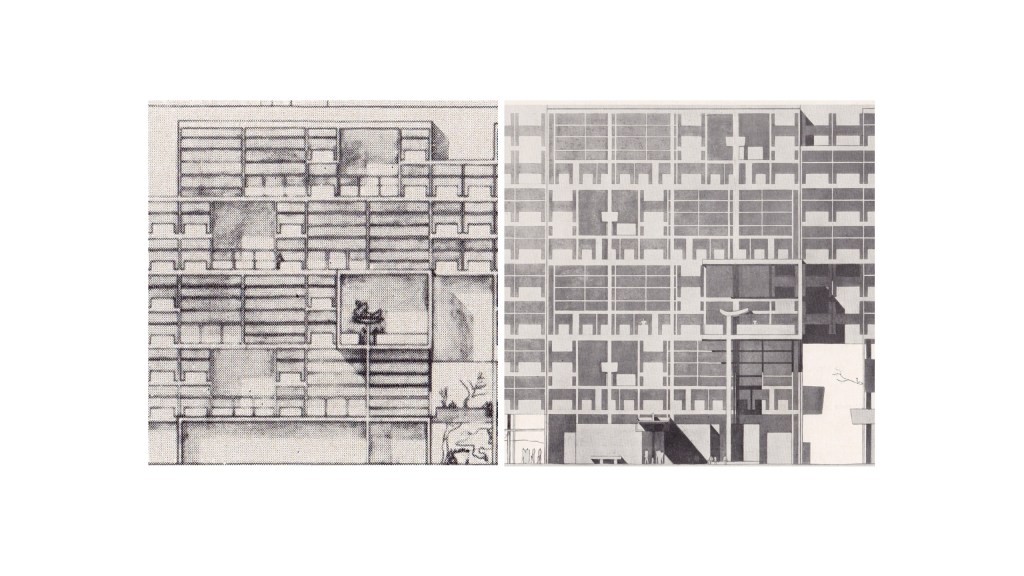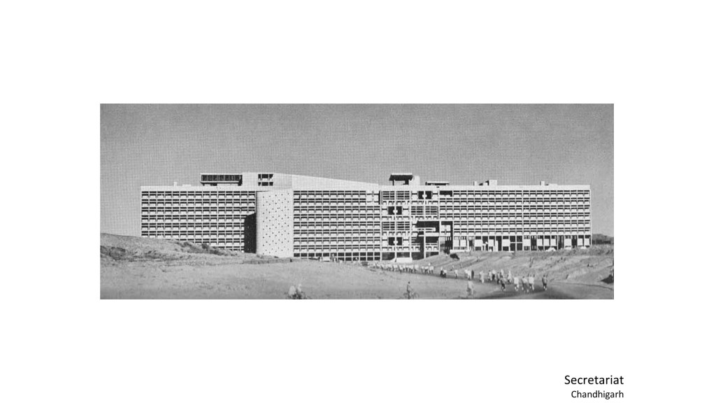 In 1953, he was given the responsibilities of completing the High Court and designing the Secretariat as an Executive Engineer. Seemingly a simple frame structure, the Secretariat was an exercise in an extremely detailed articulation of the building facade. Raj took the bold step of presenting alternatives to Le Corbusier to circumvent some of the problems that the facade of the original design presented. Here you can see the original design and what was actually built. And this was Corbusier’s design where there was nothing coming down straight and then Mr Raj actually had to go up to him and tell him that this will not work and sort of proposed a scheme which Corbusier finally accepted, and that is what you see today.