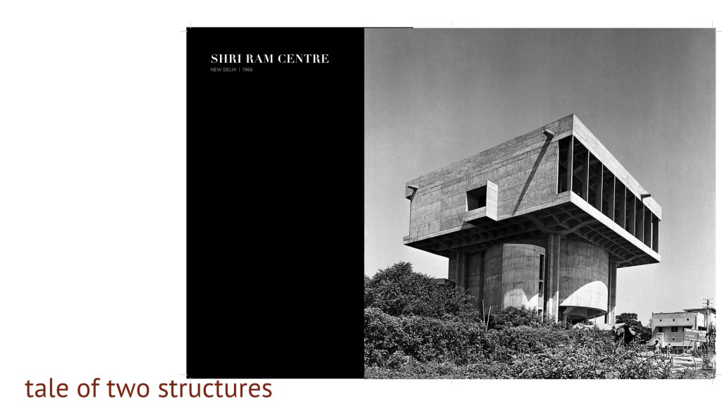 A completely different and more plastic design sense can be seen in the Shriram Center for Art and Culture in New Delhi. Here, the building is resolved through two distinct structural systems, a cast-in-situ drum-shaped auditorium and a 31 by 31-meter parasol roof supported on four cross-shaped columns. The final product that we see is quite different from the designs originally brought by the architect. For instance, the floating effect of the building, its notable features was introduced by the structural changes in separation that you see here of the parasol from the drum that Mr Raj suggested.