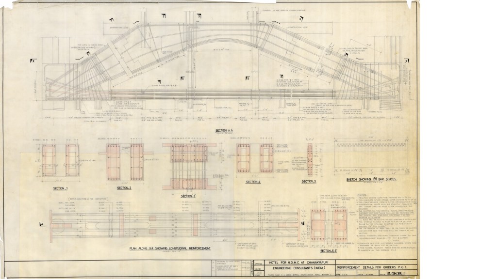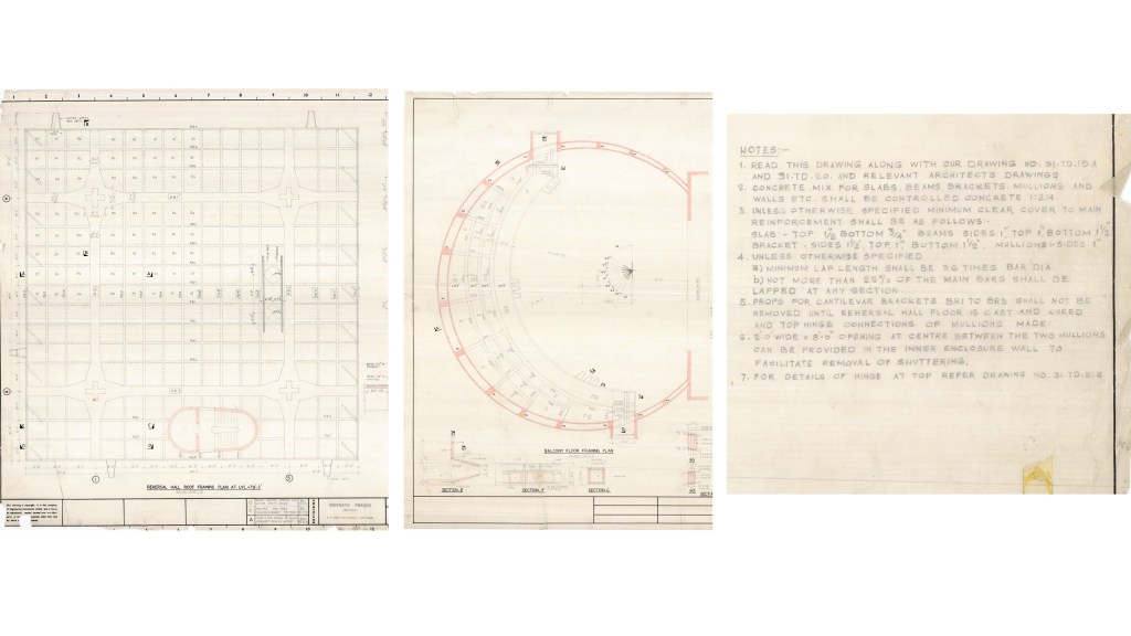 The structural drawings of Mr Raj, his projects, are historical documents and we believe that they hold the key to many hidden processes and the secrets of the structures he created. Rohit and I have tried to highlight those. In addition to being works of art, they are packed with information, instructions and indefinite details revealing how tightly he controlled the building process as a very, very integral part of his design. The construction sequence, drawings and notes we found in most of the large-scale projects, if not all, particularly during the first two or three decades of his career, the 60s, 70s and 80s when it was all hand drawings and only sort of checking help of computers, become a crucial part of Raj’s work for three reasons: