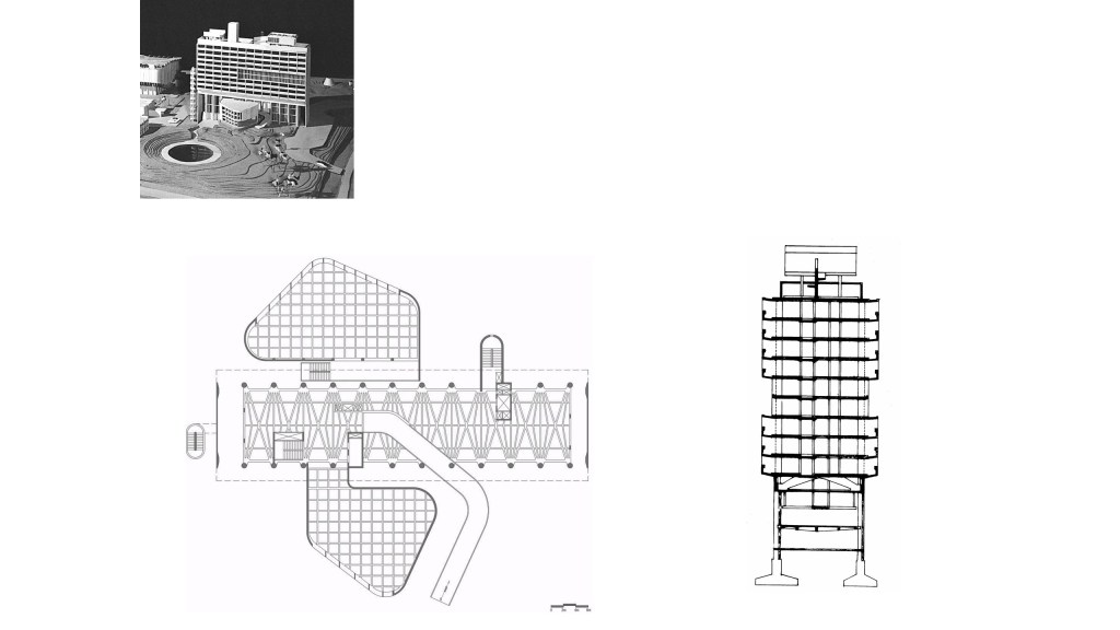 The triangular base of the 43 by 43 and 36 meter of the assembly halls, had sections which were weaving like a snake and the other axis was a straight line; so creating very simple yet complicated forms. A 30 meter by 30 meter lobby was opened up on the stepped column.