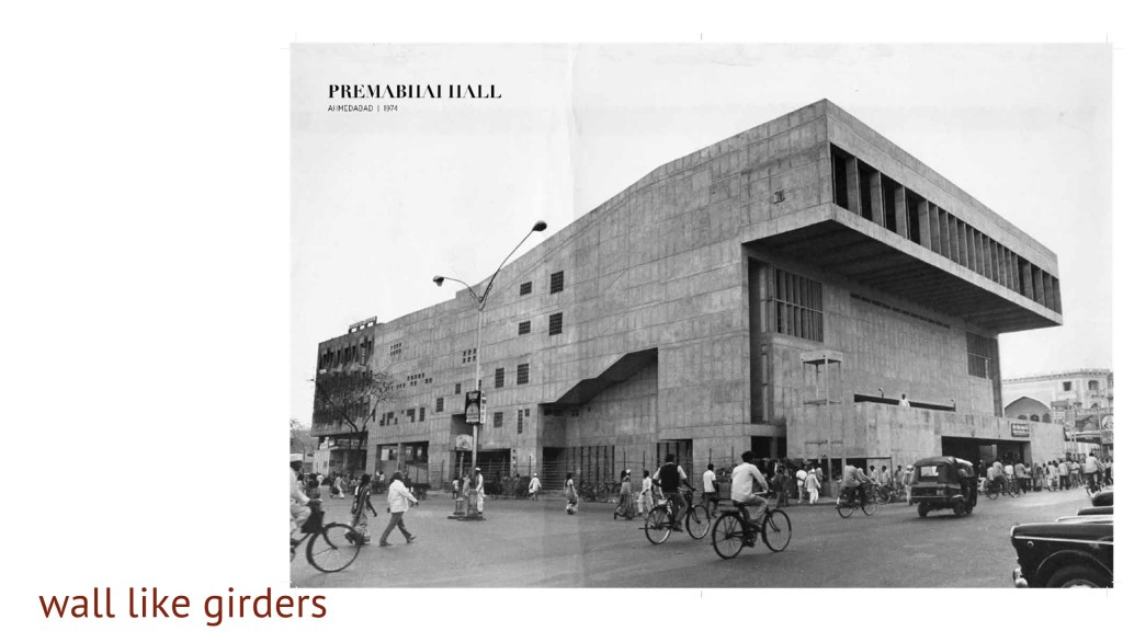 Prema Bhai Hall, also in the old city of Ahmedabad is defined by two exposed concrete shear walls with cantilevered ends that extend on to the street as if a flattened dinosauric form. The roof of the main 55 metres by 37 meters hall with a capacity of a thousand is supported on four-shaft columns again. Connected with deep reinforced concrete girders, the seating bowl supported on a 21-meter span deep wall-like girder clears the immense space underneath of all its originally proposed columns. The result, a dramatic and volumetrically complex foyer enriched by a structure of deep girders and wafer-thin ribs.
