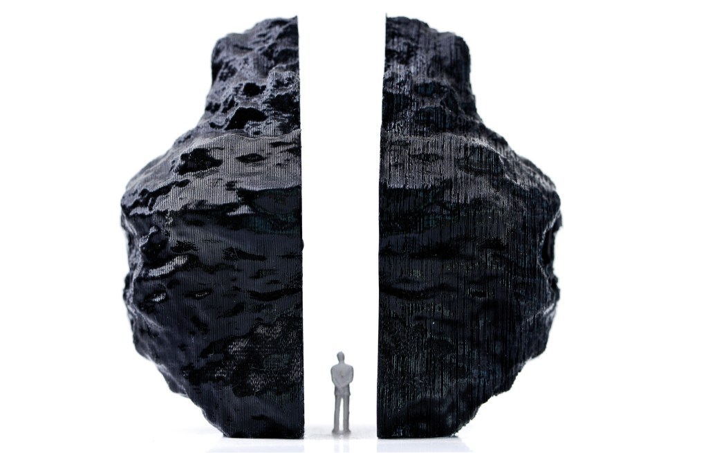 ‘See-Saw’ – with the reflective inner surface and an opaque, imbalanced shell, the text provokes thought.
