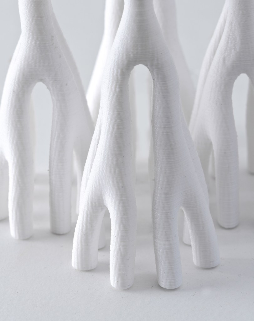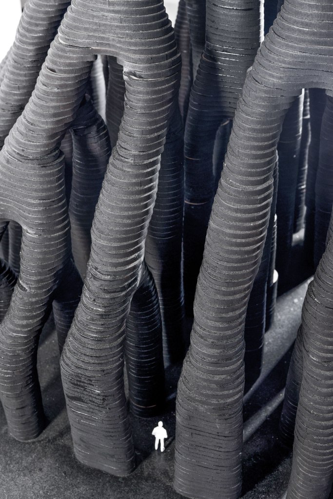 The models are exhibited true to the nature of material without any formal finish almost, “stripped bare to reveal their language of the code”. They represent the evolution of technologies across industries and critique the contemporary systems of construction. The architect personifies them as living forms engaging in a dialogue on the current state of design and construction and seeks to learn lessons on how they inform the profession.