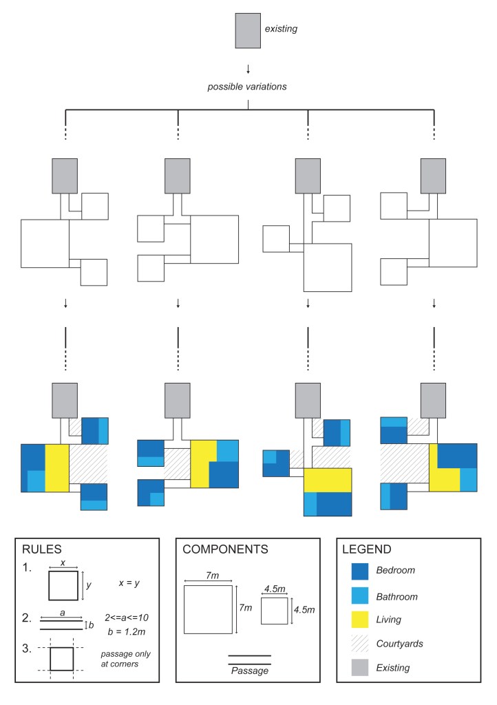 Instead of designing a final end-product, the intention is to break down the design requirements into a set of abstract elements and devise a system with a basic set of ‘mechanics’ or ‘gameplay’ – such that no matter the final outcome of the project, it retains the core architectural expression. This usually involves playing with a certain set of abstract ideas which develop intuitively through an overall understanding of the design challenge. The eventual manifestation of the design concept may take on different forms with respect to the climate, the region, client’s aspirations, preferences of style, available materials or site constraints but the essential gameplay retains the desired core spatial relationships thus ensuring execution of the architectural agenda. A good illustration of this methodology is the graphical game called ‘Morpholo’.