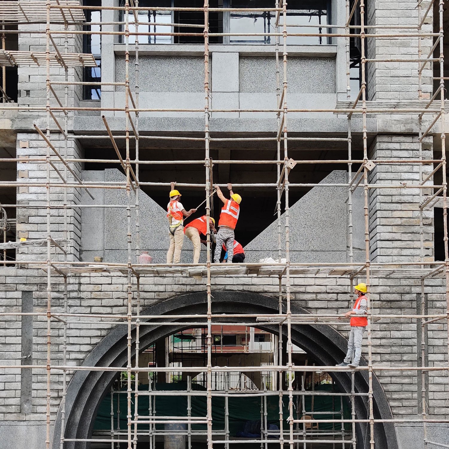The Law College building for St Joseph’s institution in Bengaluru acknowledges the structural system it is composed of, and has a very masculine expression cladded in stone and grit finish. The large building is anchored firmly to the ground with a series of arches. The structural rigour and the arches establish a visual connection with the existing school building across the ground without mimicking it.