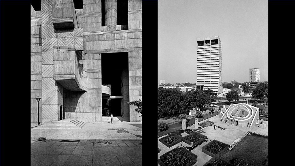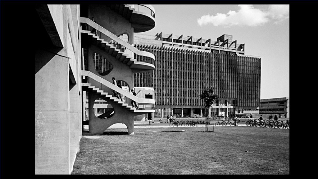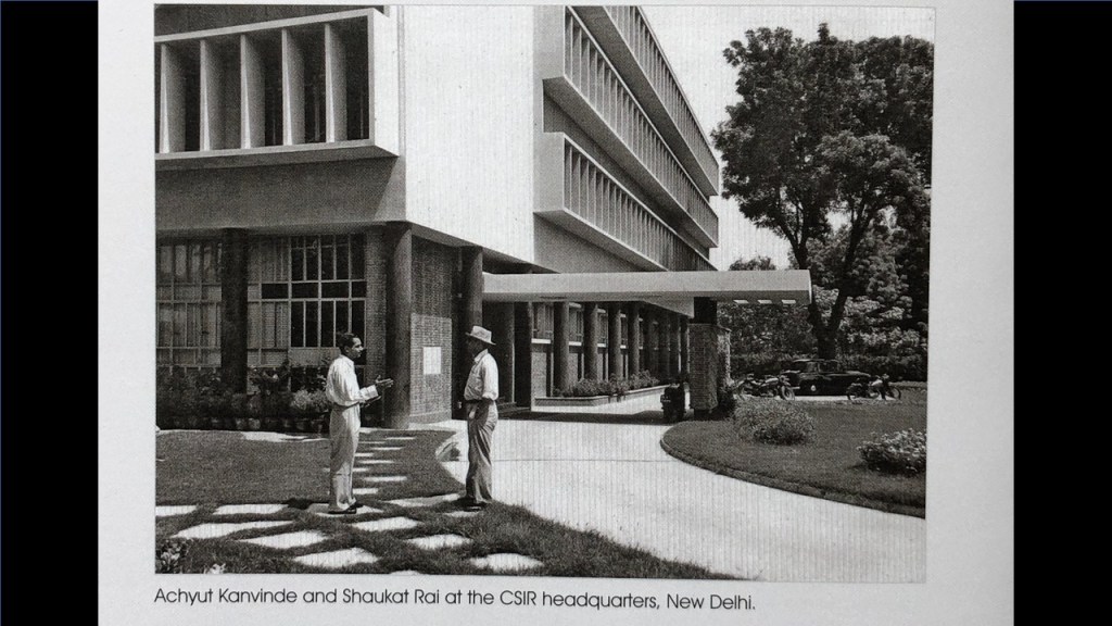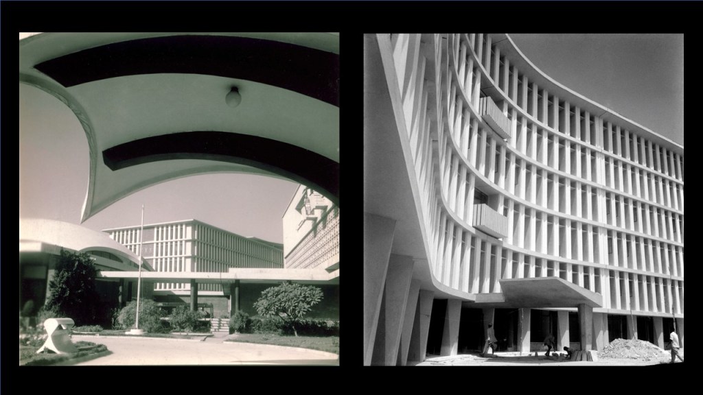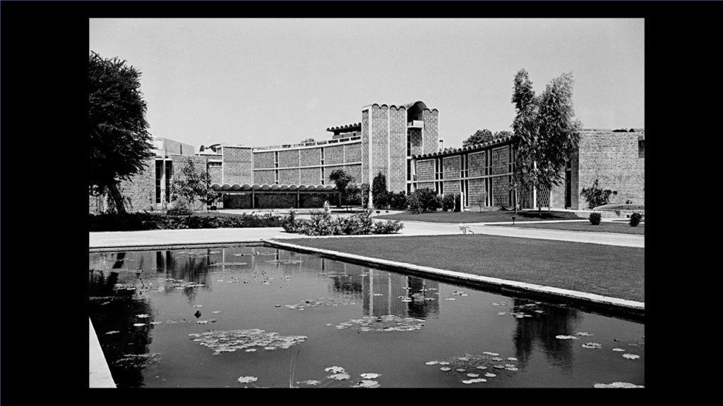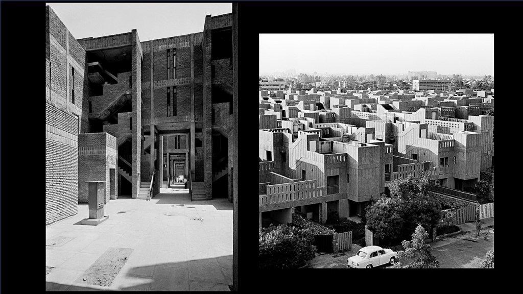 This is a Council of Scientific and Industrial Research (CSIR) building by Achyut Kanvinde (referring to image 11) and that is him with Shaukat Rai, the engineer. And I am so pleased in a sense, that because of the controversy of Charles‘ Kala Academy that the conference moved here. This is a CSIR site, and I did not know until this morning that Kanvinde had built the building next door also. Now, this is very important because what was happening in Delhi at the time was that all the institutions for science, arts, governance, law courts, were being built in Nehruvian New Delhi. The British had built their very impressive imperial ruling buildings, but there was no housing for Government staff there were only barracks remaining from the Second World War. British and American barracks, across the whole of New Delhi.