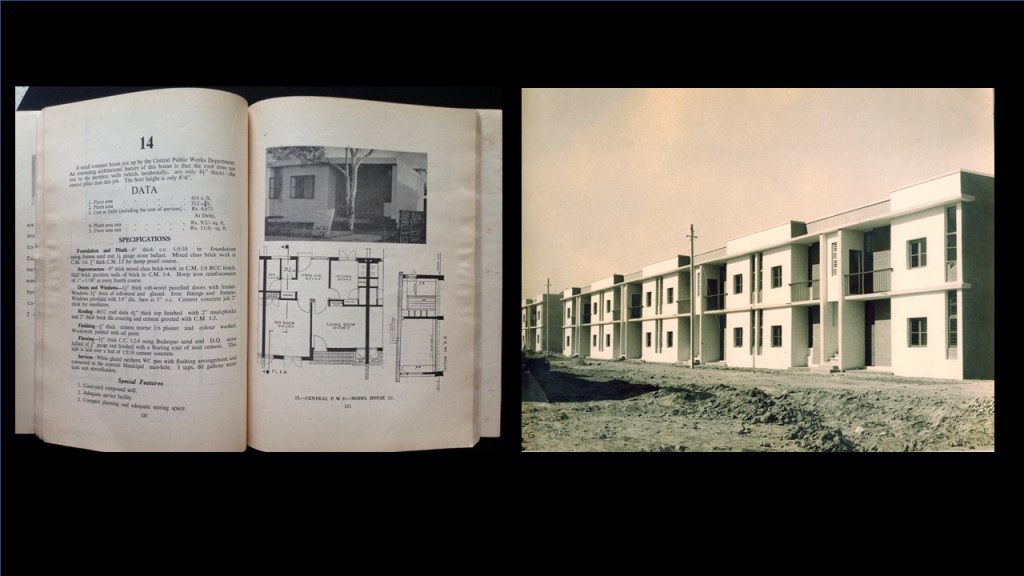 This is the 1953-1954 International Exhibition on Low-Cost Housing (referring to image 14). This was an emphasis of Nehru; that we have to bring people from all over India – engineers and architects, who actually built low-cost, small-scale housing models; in what became Pragati Maidan, which was land next to the Old Fort in Delhi. This was a hugely important initiative with an amazing publication which gave details of every single project which had come with plans, with material costs per square foot (referring to image 15). And from this model, which was done by my father for the Public Works Department came this housing in Ramakrishna Puram between 1955 and 1959. These were two-room flats which were built on a huge scale in the thousands, and they became known as ‘Rahman Flats’ because they were actually very comfortable to live in, they were full of light, and they were very practical. This kind of housing was very much inspired by the Bauhaus influence, which he got in the USA; and the mix that he had was both Bauhaus Modernism and American Modernism, which was in vogue in the 1940s and the USA. It was this wonderful mix created because Hitler exiled all the architects and shut down the Bauhaus School in 1933.