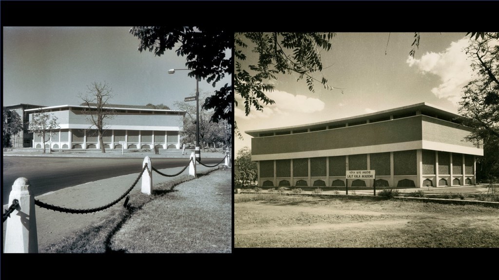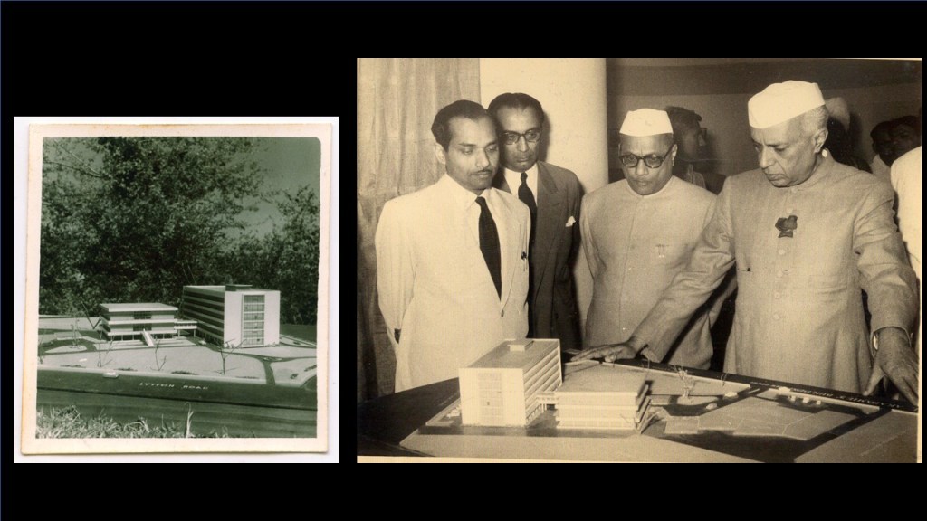 This is courtesy of Sanjay Kanvinde, which I was very surprised to find in Sanjay’s office. On the left (referring to image 20), this was the first project model for Rabindra Bhavan (New Delhi), which my father came up with. I have found this in Sanjay’s office a picture of Kanvinde on the left with the very grimacing Nehru looking at what was the model of Rabindra Bhavan. And it is a very funny picture because Nehru hated the project and he got furious when he saw it and yelled at my father saying, “What is this? This looks like an office building. This looks like the University Grants Comission building. It has nothing to do with Guru Dev, with Tagore.” He said, “You know you have done the Maulana Azad; you have done the Gandhi Ghat, which had the spirit of India in them. Why have you done this, you know corporate-looking building?” And my father said, “Well, I have never done a large building with that kind of formal language or conception.” In a way, Nehru forced him to rework it and actually worked with him to come up with what became Rabindra Bhavan. And this is a picture of him showing the plans as the building was just finished in 1961 (referring to image 21). And this completely changed his thinking, my father’s thinking. Because he said that he suddenly felt that he broke out of that rigid Bauhaus modernist mould and could think of a stylistic modernism which was related to our culture. This was using jalis, using the quartzite stone of Delhi – inspired by the Tughlaq buildings.