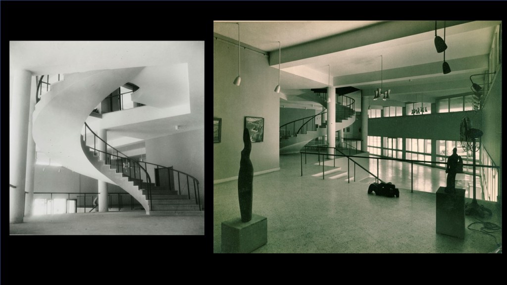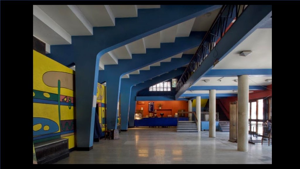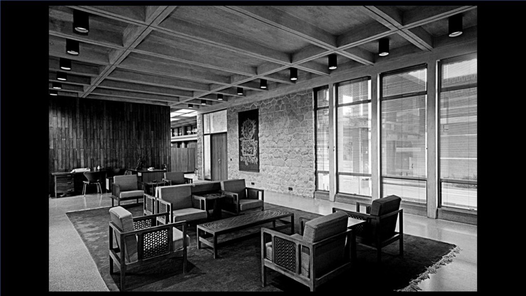 That is Escorts on the left and the Ford Foundation, Joseph Stein on the right (referring to image 40). Staircase in the Ford Foundation and that is Joseph Stein’s bald head over there and Madan Mahatta’s feet under the camera (referring to image 41). So, it is a nice picture with a little bit of history. Ford Foundation, Riten Mozumdar hanging on the wall (referring to image 42). And the India International Centre also by Joseph Stein (referring to image 43). Luckily, this building has been fairly well maintained, it has the landscape, so it still pretty much looks like this.