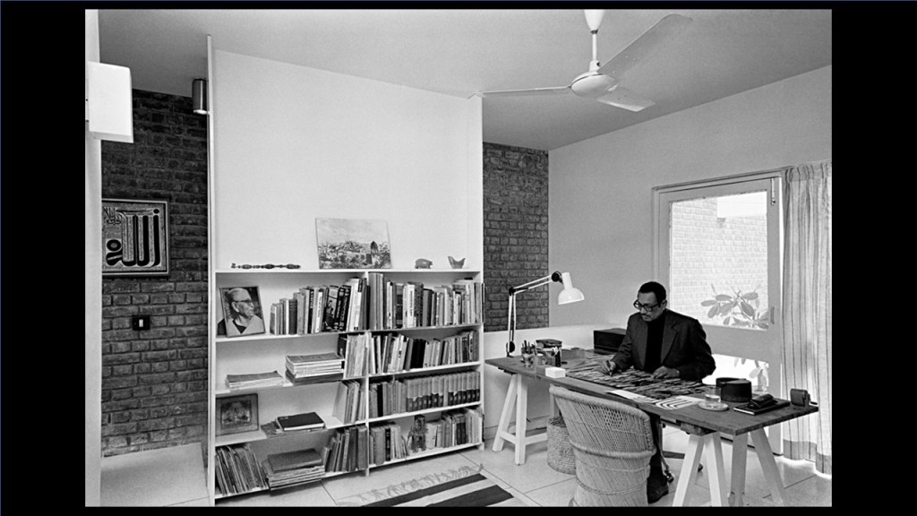 And this is Kanvinde’s Gandhi Bhawan (referring to image 36), during construction, but I love this picture because the structure is so fantastic. These are all Madan Mahatta by the way. This is Kanvinde in his own house (referring to image 37).