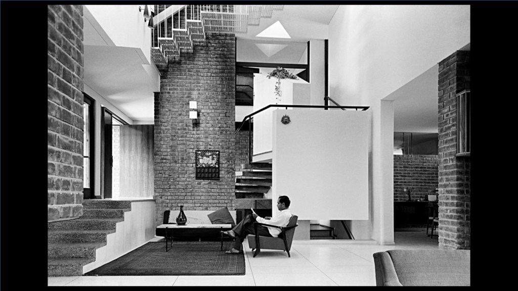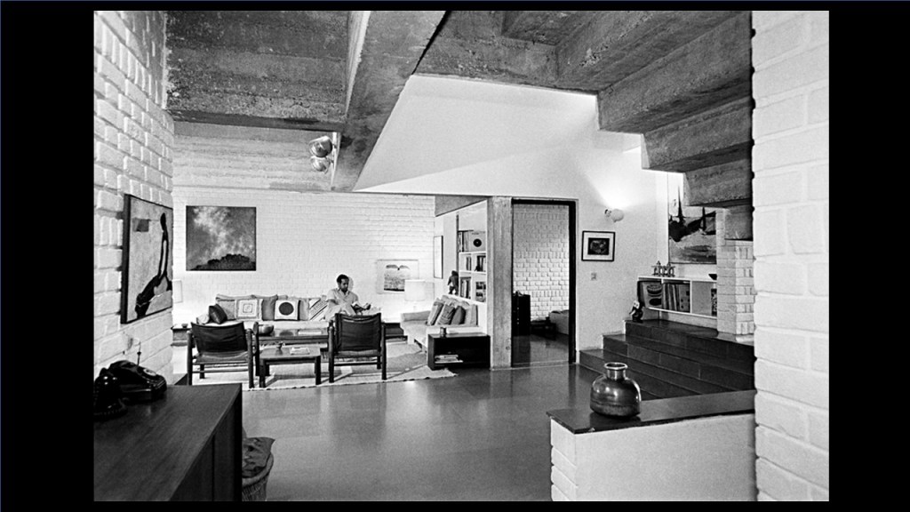 This is Charles Correa (referring to image 35). It is an interior shot of a very small little house he did, for Riten Mozumdar, who is sitting there, the great textile designer, also, very much a part of that whole modernist movement in Delhi, which included the publication of a design magazine, which propagated many of these projects.