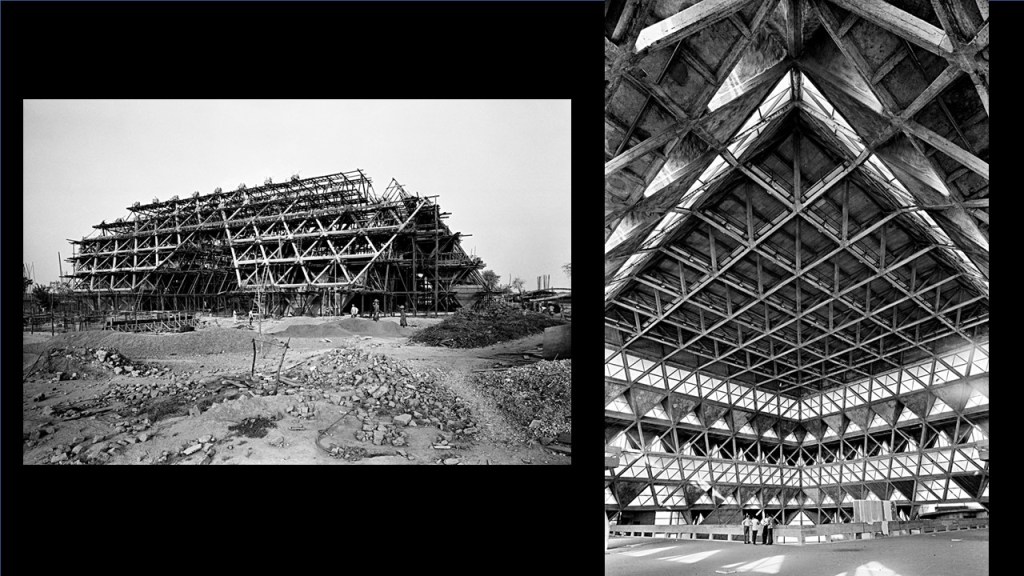 And that is Habib Rahman on the left, Hindustan Times building and Raj Rewal on the right is the STC (State Trading Corporation) building (referring to image 50), and of course, coming to the iconic Rewal tragedy in a sense, the Hall of Nations (referring to image 51). This is the building of the Hall of Nations, and this is what was so remarkable, I think if there was an iconic modernist building in Delhi, this was it. This was in 1972, built for the 25th year of Independence when we had the Asian Trade Fair. It was a remarkable feat of design conception and engineering by Mahendra Raj and you will hear more about his work tomorrow, I think. An absolute genius structural engineer particularly with concrete, completely hand-built; but a high-tech structure built by hand could only have been done in India.