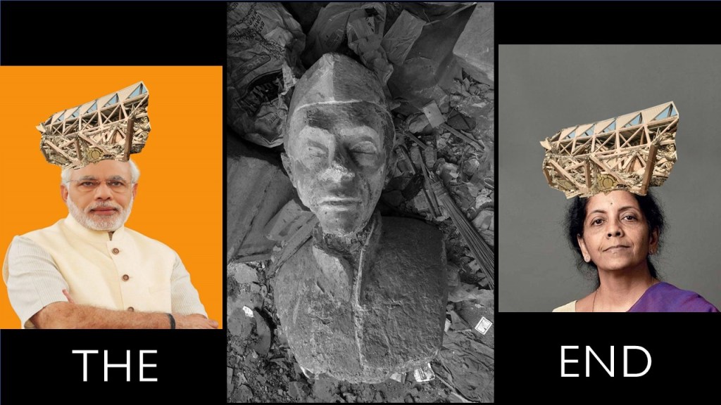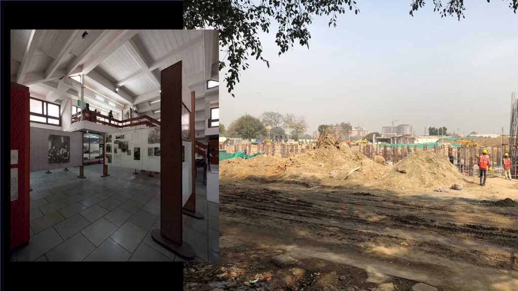 This (referring to image 58) was next to the Hall of Nations by Raj Rewal – The Nehru Pavilion which was designed to house the very famous exhibition on Jawaharlal Nehru done by Charles and Ray Eames and Ashoke Chatterjee may speak about this later today, because this was a foundational exhibition which was created at National Institute of Design, by Charles and Ray Eames. This exhibition became famous across the world for the kind of timeline style and the visual style it developed. The Hall of Nations may not have been an ideological demolition, but this building was (referring to image 58), because Nehru is you know being demolished every day. Most recently if you saw the debates in Parliament on Section 370. That was the site after the demolition (referring to image 59), and nobody knows what happened to the exhibition. It has vanished.