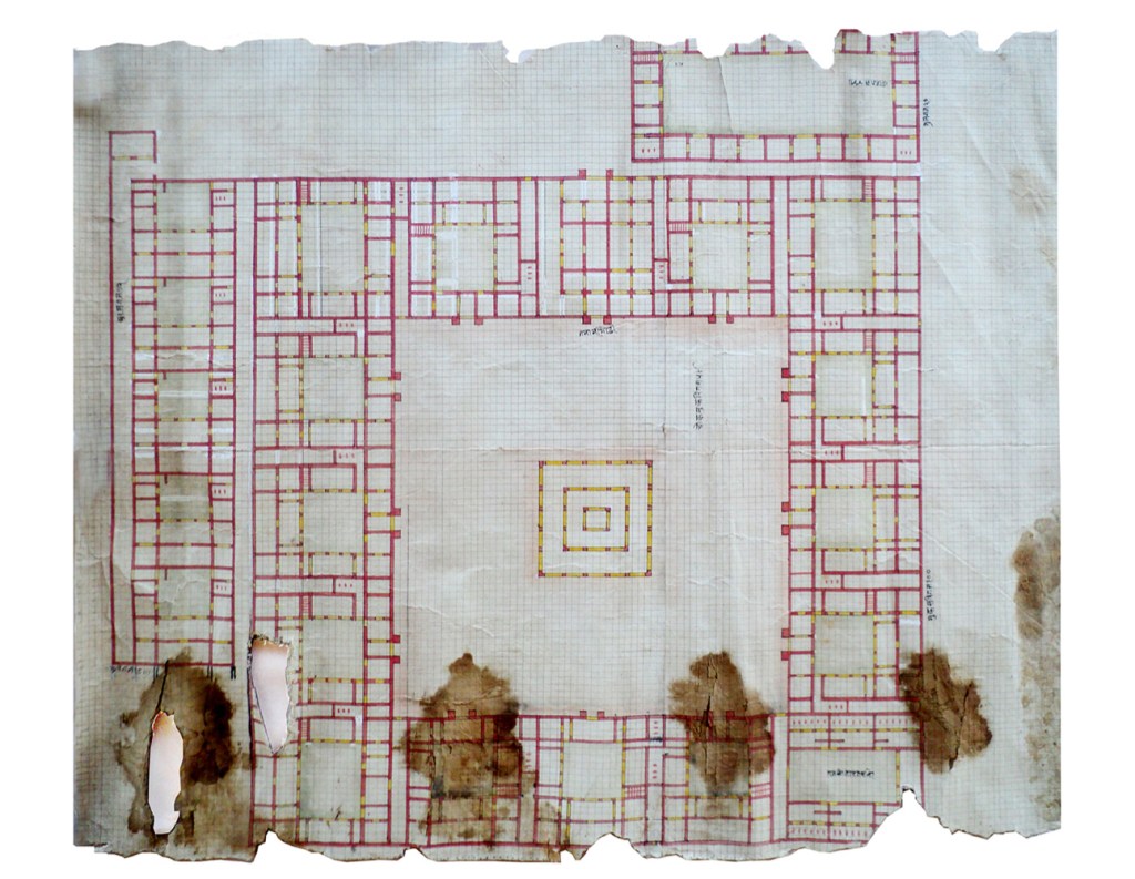 The second drawing is that of the Madhavendra Palace in the Nahargarh fort in Jaipur. At first glance the drawing seems to be drawn through an orthographic logic. However one soon realises that the drawing is square in proportion, as opposed to the actual building which is rectangular and that in the drawing, the X and Y axes are not at the same scale. There is another logic operating here, which is not a cartographic one. It is a diagram, where the communication is a set of rules that the co-producers of the building have set up for themselves. Here the imagination of space seems to be produced through an understanding of an architectural type consisting of multiple aggregations of a unit space, each unit composed of smaller spaces around an open court for each queen, separated by secret movement corridors for the king to traverse, no wider than the width of the king himself. Here body, pleasure, event and space refract and come together in unstable ways, to produce a spatial imagination that has multiple continuously re-forming referents. (Fig 3)
