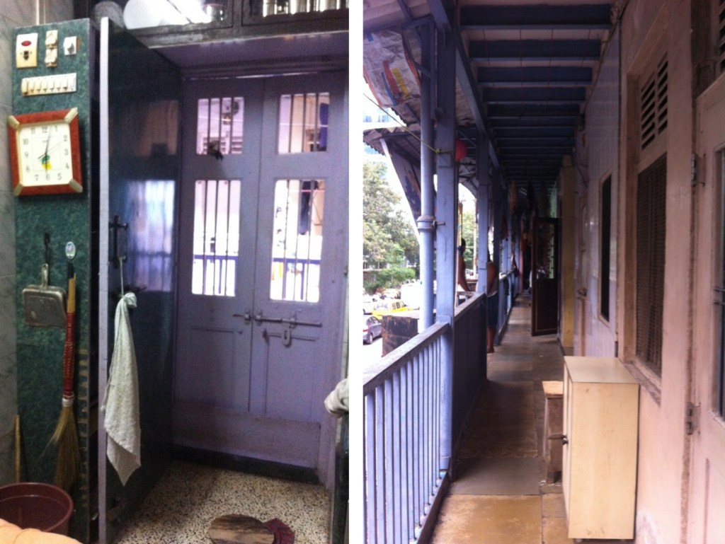 Two year old Sharan rides his tricycle through the porous house of Jankiben and her ailing husband, across the bridge, spanning between the two wings, overlooking the narrow courtyard of the Poonawala Chawl2 , a working class building in Mumbai (Fig 7). On the bridge, Dominique sits in a chair reading a newspaper, oblivious to Shanta and Durga, who are fighting over the use of the common toilets. Reshma calls out to her daughter playing with her friends on a large trunk on the mid-landing of the staircase. No one remembers who put the trunk there. It has become collective property, like the multitude of other orphaned furniture around. The corridor widens into a balcony, where Rahima sits with her crutches watching the street for hours on end. Jankiben’s husband has been bed-ridden for more than three years. He lies on a cot in the multi-purpose front room. In Jankiben’s house, the shutter of the kitchen cabinet is peculiar. Like a Duchampian door it toggles between its day and night positions to secure the house at night. Jankiben has managed to get this architectural detail executed with the help of a carpenter she has known for many years. This saves her money as she does not have to pay for two shutters but also keeps her home open through the day, allowing the passage of breeze and passers-by who keep a watch on her and her husband (Fig 8). In the absence of monetized social security, visitors who keep tabs on the old couple help fill the gap. Poonawala Chawl acts like one big house.