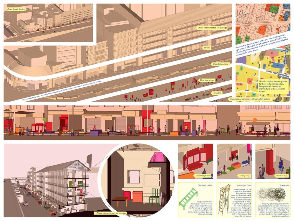 The psychologist James Gibson uses the term ‘affordance’, referring to the properties of a given environment that offer actionable possibilities to an animal (Gibson 1979). For example, while the form of a chair affords one sitting on it; the form of a tall pole does not. It may nevertheless afford one to lean against it. In the case of the Poonawala chawl we saw how the common corridors, bridges that extended the movement, the porous tenements and the shutter details that facilitate this porosity all create affordances for a form of sociality where, in the absence of state sponsored social security people watch out for each other. Similarly in the case of the building on Lamington Road, the five layers of space, invisible on a map, produce the multiple social relationships that constitute the dynamics of urbanity. As opposed to this are the spaces of urban renewal that create hard edges, where the built-form lacks transactional capacities.