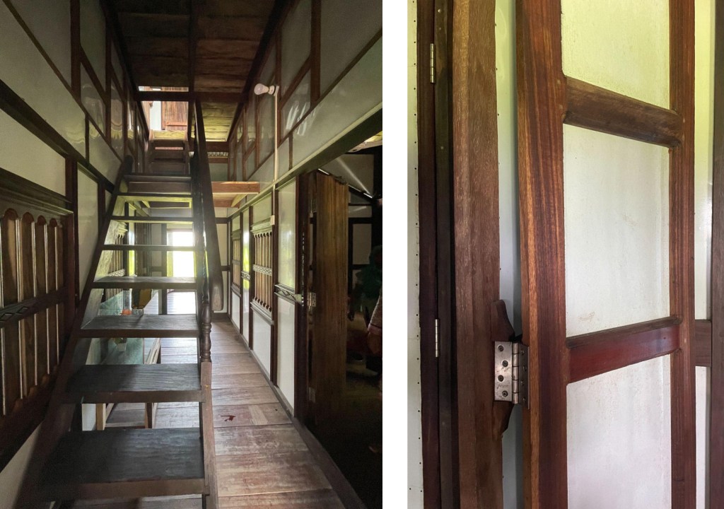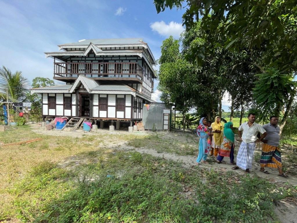 Shaheedabegam moved into her prefabricated house in Toilkai at the outskirts of Dhaka in Bangladesh, with her family in June 2021. It is a two and half storey house with 5 bedrooms, a living-dining space, kitchen and four verandas. They call it an ‘Arai Tala Bari’ (two and a half floor house). The verandas open towards potato cultivation lands. The plinth is elevated on cement posts and measures 3’-6’’ from the ground (Fig 18-21). The house was assembled piece by piece in Shaheedabegam’s front yard by expert carpenters from Baligaon. The upper floors are accessed by wooden stairs. The door frames are thin and not more than an inch in width, with a decorated slug designed in places where the hinge has to be installed. This also makes the houses lighter (Fig 22). After a year and a half, the house is still unfinished. The family wants more decorations on the façade, which are available as a kit of parts in the local markets. The settlement pattern of Shaheedabegam’s village, Toilkai, is of a ‘Dig-Elevate-Dwell’ type. Before the houses are built, the land has to be prepared by digging around it and elevating the centre, to ensure that it does not flood, at the same time preparing the ground to take the excess water. Shaheedabegam’s family moved to this place from the floodplains of Munshiganj, where the land had got inundated and it was impossible to live there anymore. That is when they shifted parts of their house to this new land and extended it, making a bigger house.
