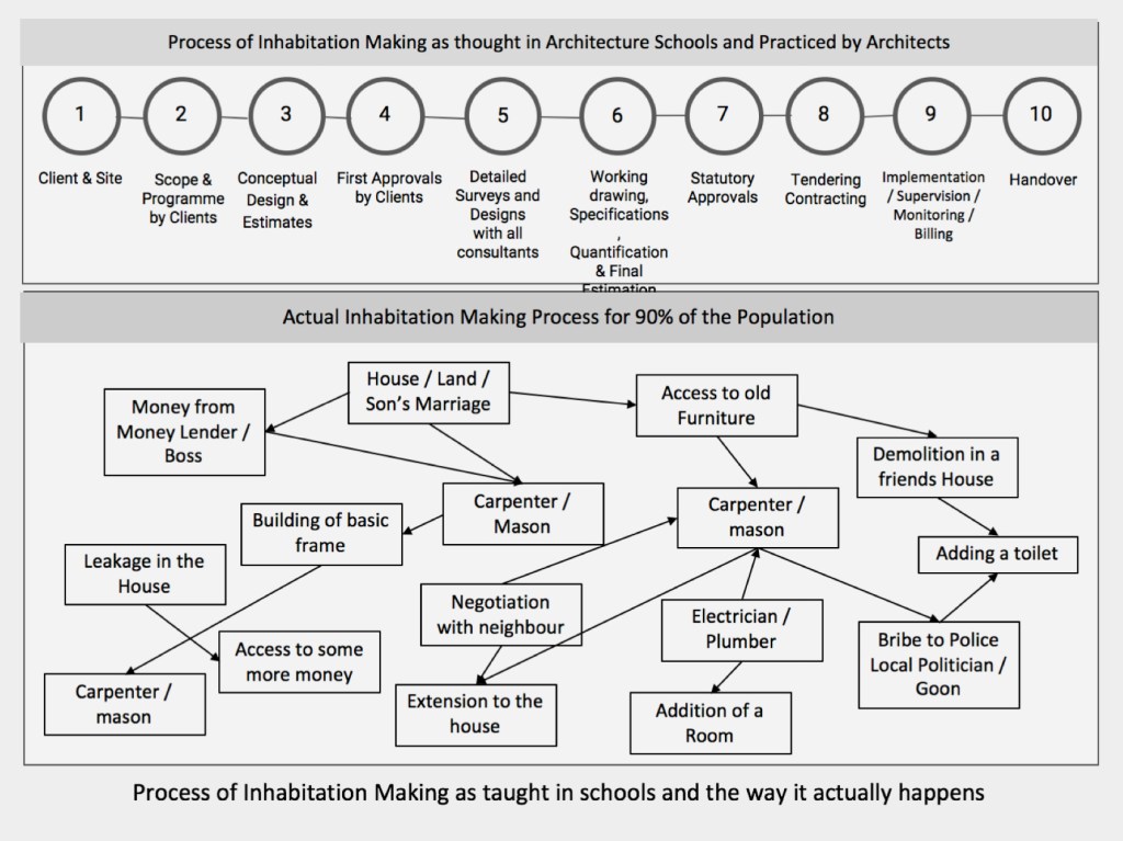 In order to redeem this situation as architects we need to recalibrate ourselves from the ethics of the profession to ethics of humanity. We need to move away from merely thinking of space as a container, to understanding space as socially produced. Here funding logics of the project, organisational logics of the studio, relationship between the architect and the staff and the relationship between the architect and the client / society all would need to be re-evaluated. Here Edward Soja’s formulation of Spatial Justice (Soja, 2010) becomes important for architects to think from. Soja says it is important to “emphasize explicitly on the spatiality of justice and injustice not just in the city but also at all geographical scales”. He further reminds us that “critical spatial thinking hinges around three principles: a. The ontological spatiality of being – that we are all spatial as well as social and temporal beings b. The social production of spatiality (space is socially produced and therefore can be socially changed c. The socio-spatial dialectic (the spatial shapes the social as much as the social shapes the spatial) Due to this intrinsic relationship between the spatial and the social he notes how all disciplines including archaeology, poetry, religious studies, literary criticism, legal studies and accounting have started recognising and applying a critical spatial perspective. Architecture and Planning become all the more important because these disciplines are spatial to begin with. While Soja as a geographer identifies, locational and spatial discrimination with respect to class, race and gender, exclusionary zoning, institutionalised residential segregation as well as core-periphery spatial structures of privilege from local to global space, in his purview of spatial justice, this paper identifies other evaluatory frameworks to understand the coordinates of spatial justice. Architecture seen through the frameworks of transactional capacities, settling, and trips, kicks and enjoyment, registers spaces as corrosions, refractions, seepages and entanglements with the force fields produced by urban processes and social relationships. As opposed to seeing spaces as empty containers, these processes give clues to creating multiple affordances, to increase transactional capacities – these being higher accommodation of densities, higher activities, increased diversity, better security, safety and care; and higher possibilities for poetic imaginations. In doing so these ideas intersect with the writings of other urban scholars who promote an assemblage urbanism, where the politics of making, inhabiting and living are deep entanglements enmeshed within contemporary urban conditions, aspiring to make changes from within, rather than from utopian demands that a universal modernity aspired to but failed miserably. We also argue that to achieve this the very modality of the architecture studio needs to shift. We need to build a longue durée practice that is curious about life and living, innovate on funding mechanisms, work with organisational structures that foster curiosity and an egalitarian work ethic within the studio, building relationships with clients that interrogate life with them, but also look at our projects not as the ‘property’ of clients alone but as custodians of the environment and a socio-cultural life beyond that amounts to a spatial justice at multiple scales. We need to shift the objective of the studio from the design of containers to the design of life.