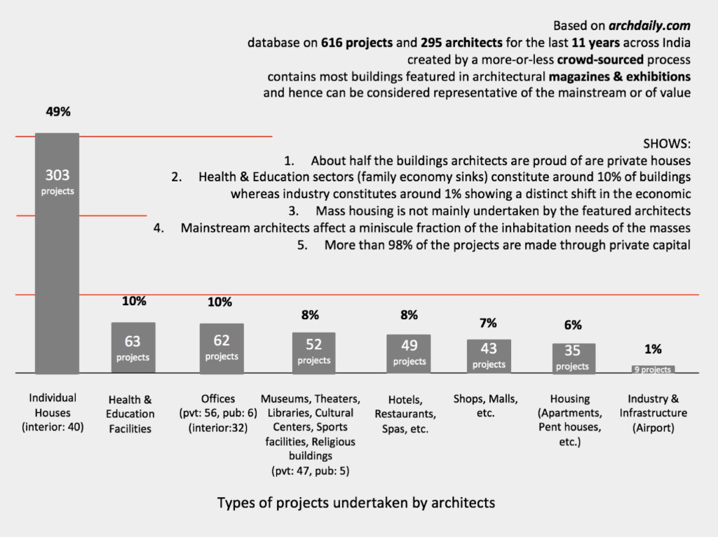 One may argue that these are ‘developers’ projects and architects have very little to do with these. But if we go by the ArchDaily archive, which is a crowd-sourced data-base of contemporary projects, uploaded by architects themselves, so perhaps it is safe to say these are the ones the architecture community is proud of, one sees that from a cohort of 616 projects, over 11 years across India, more than 50% buildings are private houses, 10% are from the health and education sector (family economy sinks), 10% are cultural spaces, 1% are industrial projects and so on (Fig 33). Moreover 98% projects are funded by private capital. Mainstream architects actually affect a minuscule fraction of the inhabitation needs of the masses.