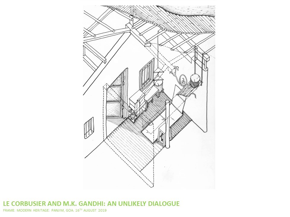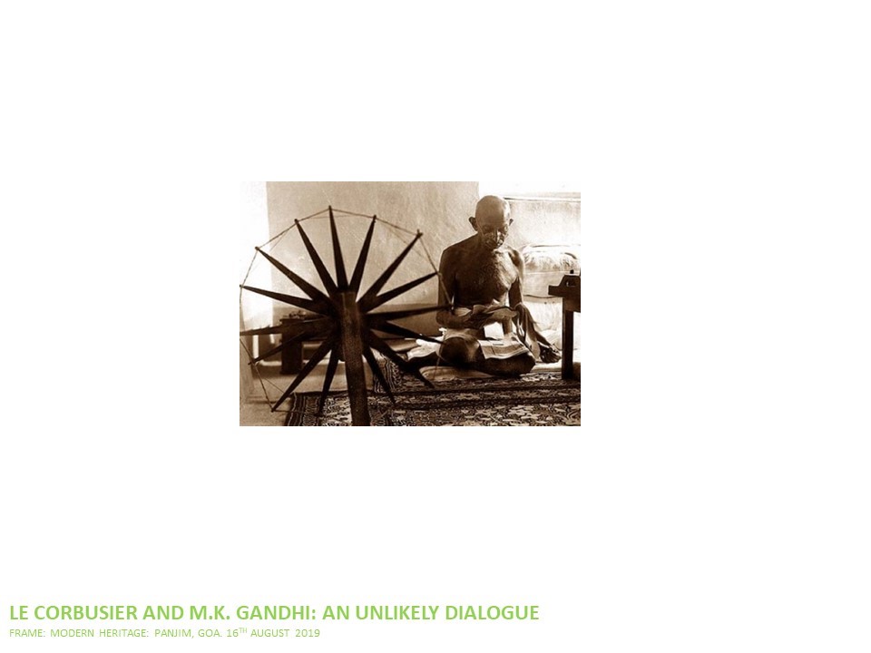 Often the narrative of the present in which our history is written remains covert. One of the things that I enjoy about this method is that it ensures that the preoccupations of our own time are integrated into the narrative while always remaining explicit. Given the formality of our gathering today, I have chosen the form of a dialogue between one, Mr. M.K. Gandhi and another, Le Corbusier rather than a causal chat in a Byzantine café.