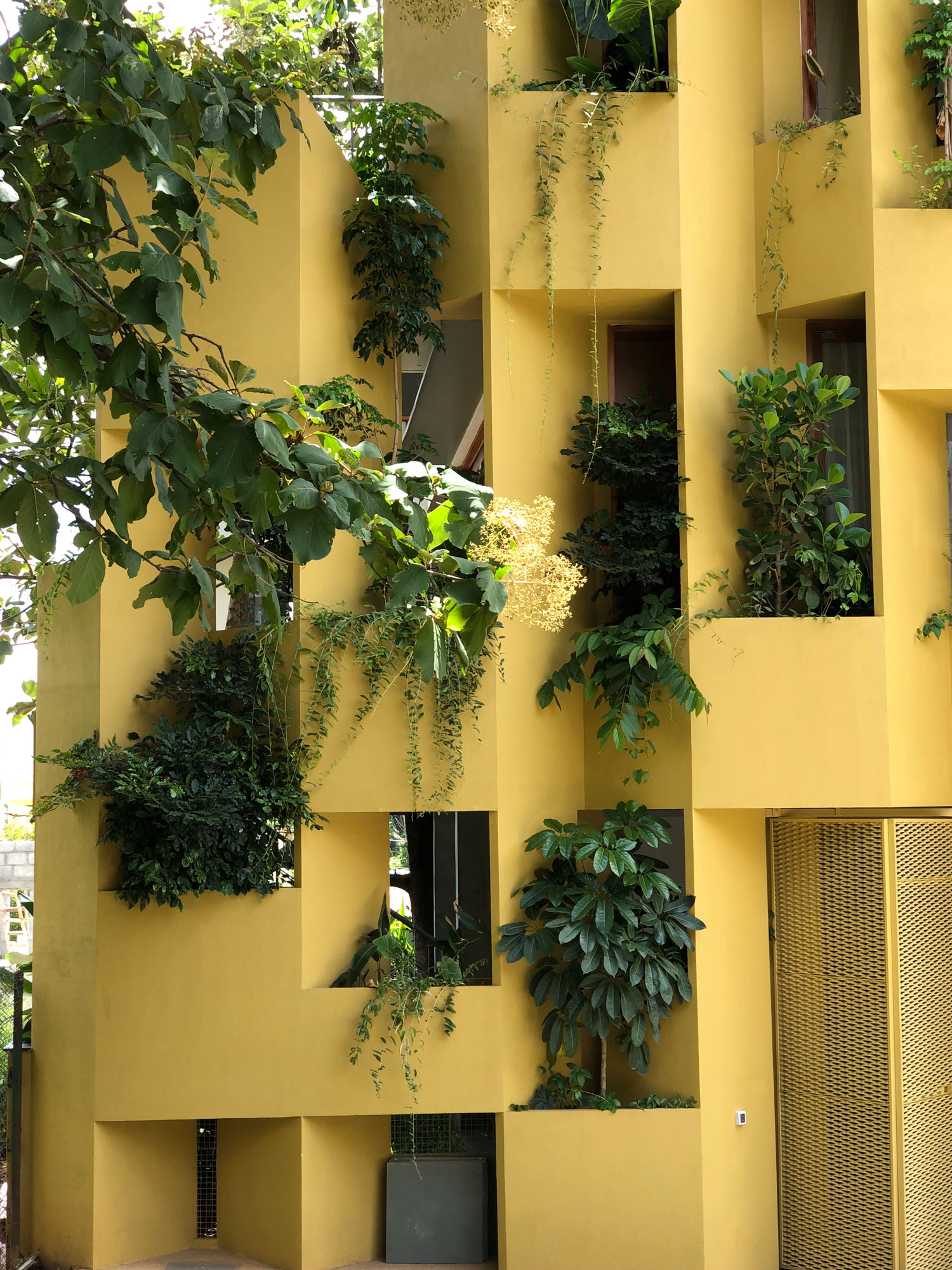 AA: Bengaluru as a context, is a garden city. How do you respond to the garden city, in a tighter place as well? We started our first project in Bengaluru called Breathing Enclosure, which is a renovation project- not completely done by us, the building was already existing. The client came to us with a brief of having a facade-elevation design – we convinced him, and the client was very accepting in that sense, that we tried reflecting the sense of a garden city into that elevation. It is not a dead elevation of some cladding, it is breathing, which breathes over time. We have these vertical ferrocement troughs, which are all along the sides, and the internal spaces look out, and we got a verandah, which segregates the buffer between the outside and the inside, and the building is a complete enclosure with green. That was a start point, where we felt that in a tighter space as well, you can reflect the idea of a garden city.