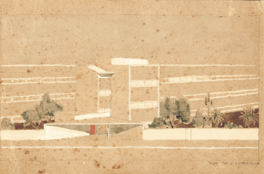 This is a very beautiful early watercolour done in Japan by Antonin Raymond, showing the conception of this new building (referring to image 09) and we found a quote from a letter he wrote to Sri Aurobindo and the Mother saying that this building had to represent principles and not an aesthetic portrayal that might be perceived as cartoonish or caricature of that which had already been, it had to reflect abstract principles dealing with climate and material and structure. So already, the notion of a tectonic expression, a material expression was coming alive in the way, because, for 1937, this is a pretty radical drawing.