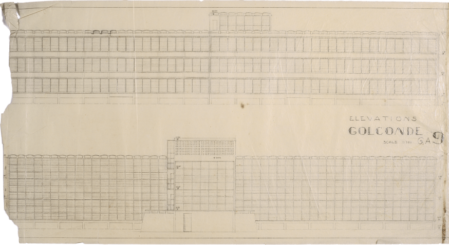 We found an original drawing (referring to image 18), showing how they propose to build a full-scale prototype, to understand how concrete might react in this context, in this climate- how it might be poured, how the mixes might be improved. India did not, at that point, manufacture either cement or steel. With the war going on, the cement had to be imported from France and the steel from Japan and this was a very expensive proposition. The Ashram at that point- we found the original bill of quantities and the building actually was built for that money, the original, stipulated budget was one lakh and one hundred rupees for the entire construction of Golconde, one lakh and one hundred.