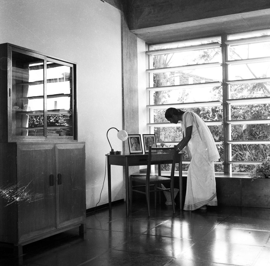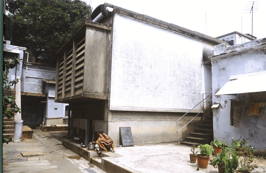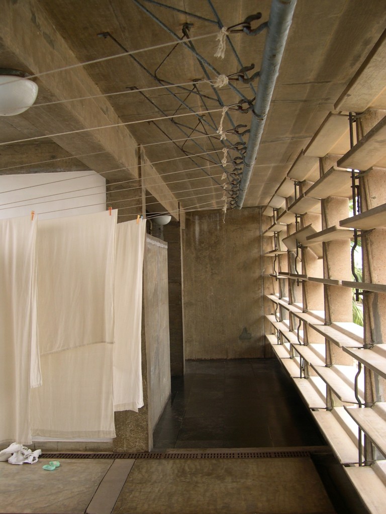 It became very clear to us as we researched this building that the patterns of use were completely understood and factored into the design. So you can see that every morning, the two-hour process of washing, folding the laundry, and then taking it up to the residence is all done on this plinth (referring to image 55) and this plinth is a concrete water tank that collects the rainwater from the terrace and you can see the height has been calibrated so that actually acts like a piece of furniture. And there was a wonderful sight every morning, between 9:30 and noon, where a line of 14 or 15 workers would in their coloured saris would be adding this vital presence to the building and there were layers and layers of this laundry being folded on this building, on this plinth. If you can see (referring to images 53 and 54), here are the pivoting windows. Again, the hardware was designed to allow the breeze to ventilate the subterranean rooms and here all the louvers are now closed. So, every morning those louvers were opened and closed depending on the circumstances of the temperature.