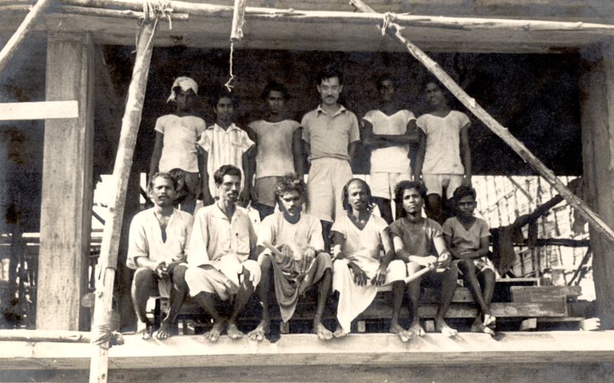 Here is an early photograph where you see George Nakashima in the sunglasses with a bunch of the early devotees (referring to image 12). At this point, as the schematic design is complete, Nakashima arrives in Pondicherry and starts working on a set of construction drawings. The Mother informs Antonin Raymond in a letter that Sri Aurobindo had decided that no construction company would be allowed to build this building. They did not want a commercial enterprise. They did not want a contractor, to build this building. Raymond wrote a letter back asking, “Well, how else do you imagine we are going to pour concrete for the first time in India?”. And the Mother answered their letter with a missive saying- that we have devotees. They are poets and philosophers and historians and cultural theorists, and they will pour the concrete. This is the original band of the construction workers who were going to assist George Nakashima to build this building (referring to image 12). So again, you can understand that there is a utopian sensibility about the way this building would come to be.