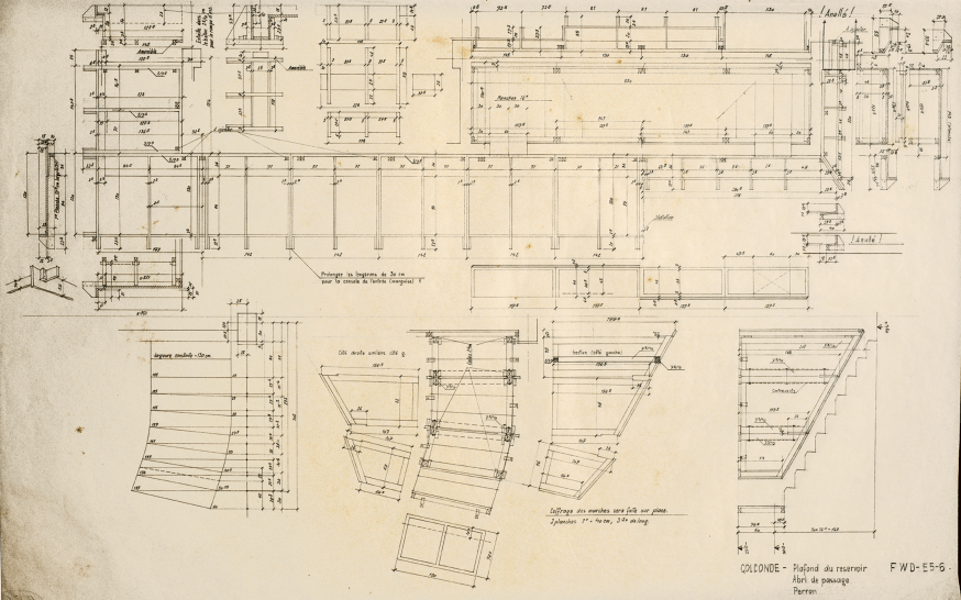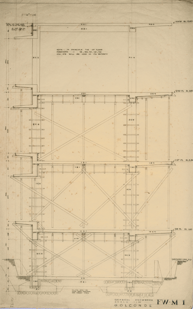 And so beautifully drawn, these original pen and ink drawings were done by Nakashima to design the formwork to pour the concrete with teak shuttering (referring to image 24). And there is a whole set of these shuttering drawings, that are in the archives in Golconde, and they developed in addition to the sections, these are called the formwork drawings (referring to image 25), all drawn by Nakashima, Udar Pinto, two or three other devotees that he was training there to teach the labour how to erect the formwork, which would allow this concrete to be poured.