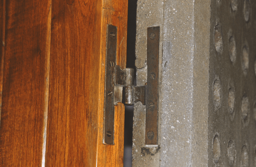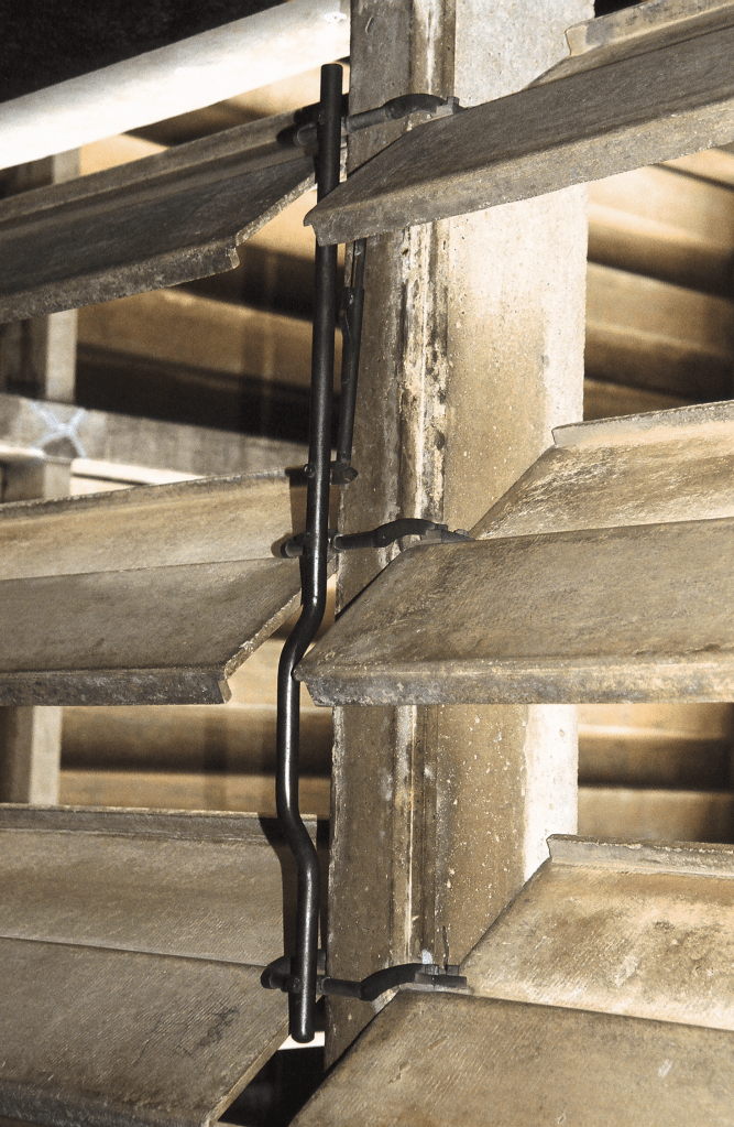 There was no hardware industry in India at that point. There was no such thing as building hardware and now, Nakashima and Raymond have designed these operable cement-asbestos louvers to be modulating the breeze and the light and so they had to design the hardware (referring to image 34), but given that the war was on and there was no steel foundry or casting industry there at that point, the Mother organized the collection of all the brass vessels from the Ashram and they created a foundry on site. It is still there today in Pondicherry. All of these utensils were collected from the devotees and the Ashram, melted down. Hardware was designed and built by Nakashima on-site and then used to operate these louvers and I will show you photographs because even today that hardware functions perfectly.