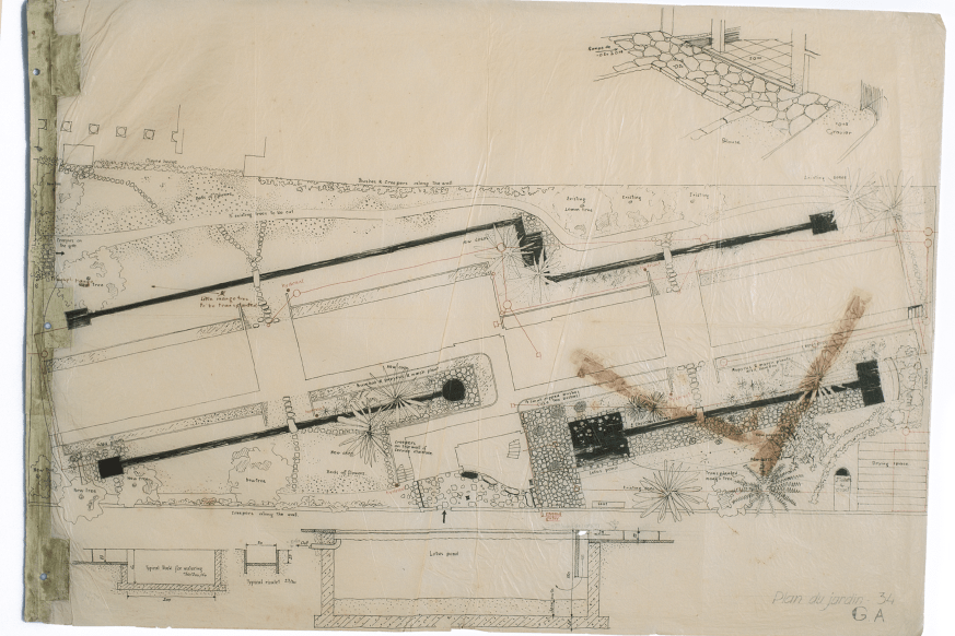 And here it is, it is showing the footprint of the building, it is showing the rainwater channels, it is showing the planting strategy, again, a very tight site. So by rotating the building to that axis, the triangle shape gardens that resulted on the north and south were very carefully, sculpturally planted to create this haven of landscape and tranquillity. You can see even the sketch done by Nakashima showing the pattern of the flagstones to be laid at the entrance. There it is (referring to image 42).
